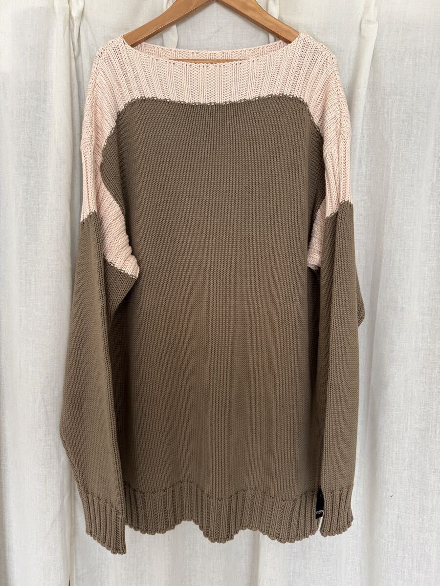 ベージュ × 淡いピンクの切替デザインで、肩幅広めのオーバーサイズシルエット。