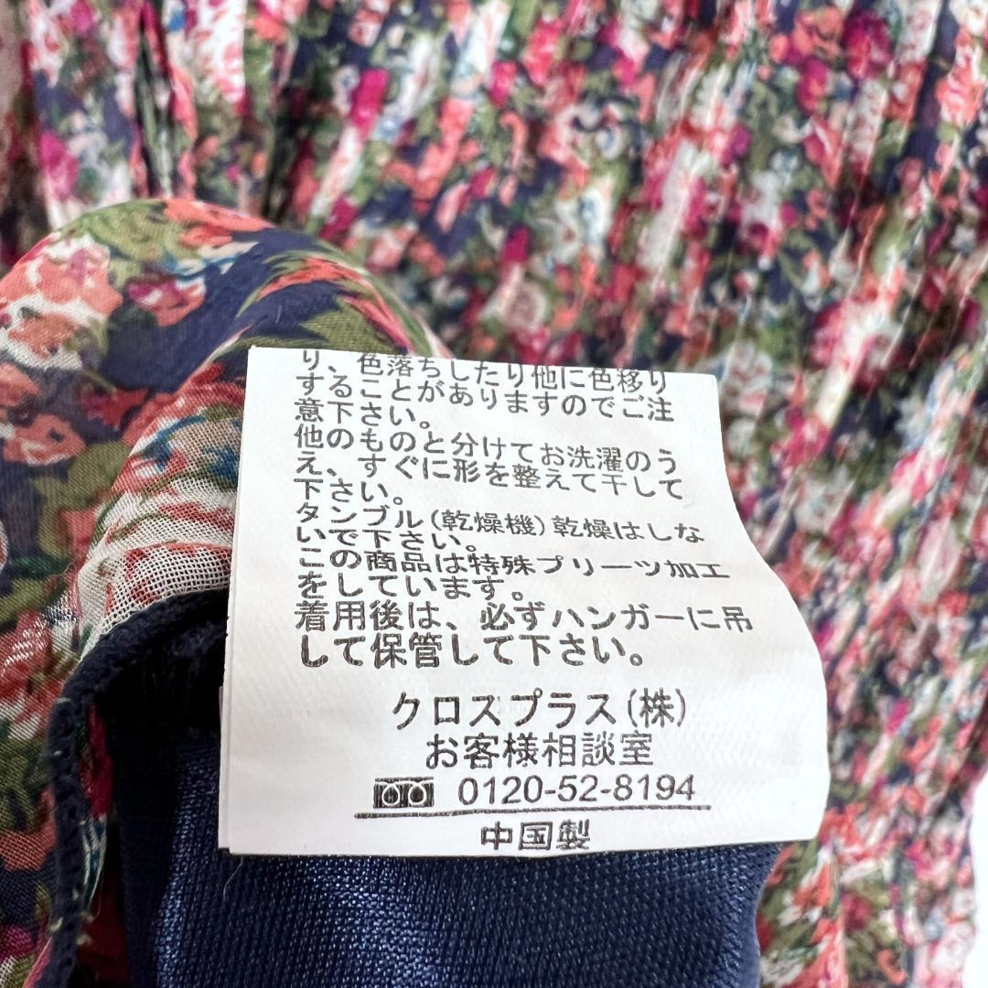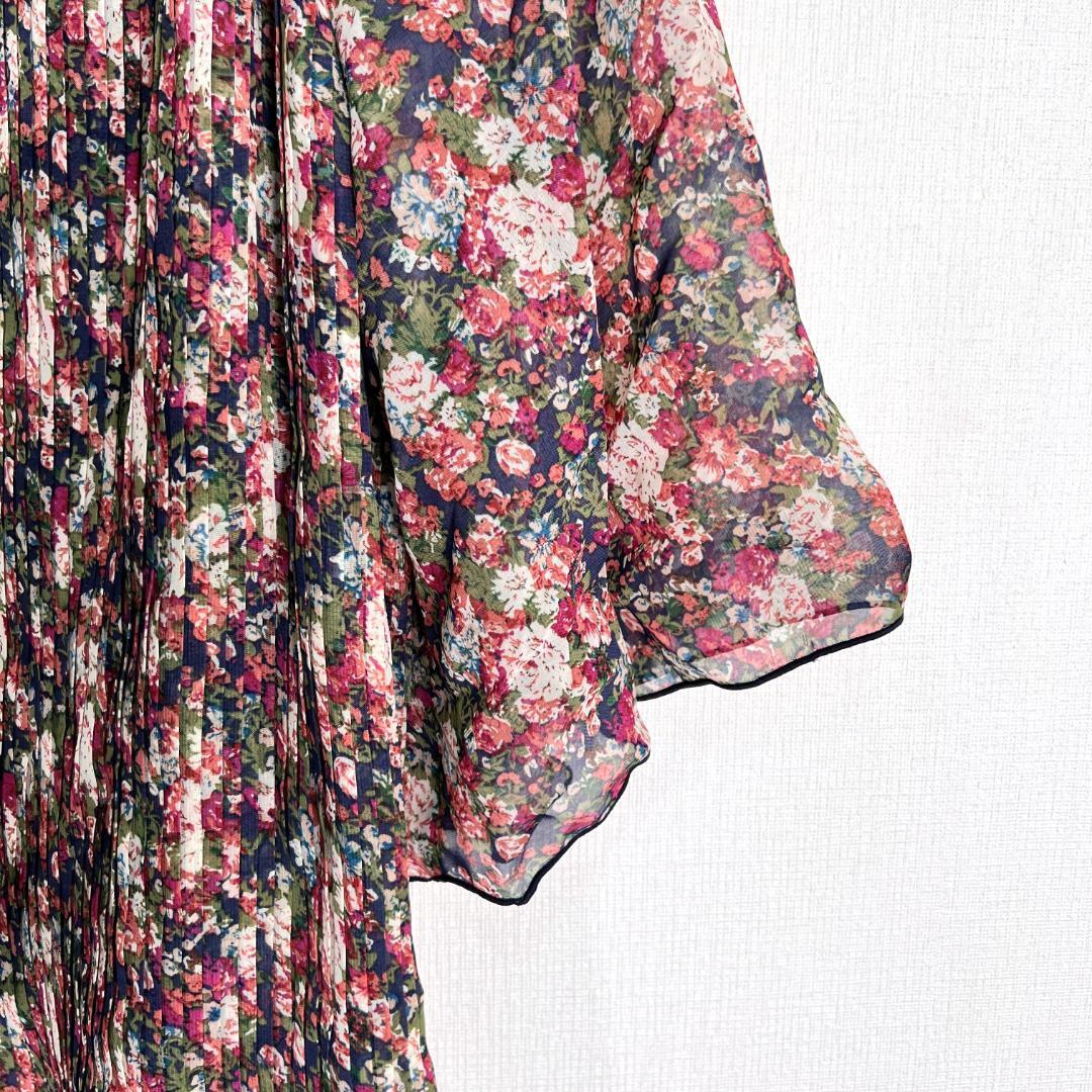 女性用 レディースのネイビー系の花柄チュニック カットソー トップスです。中古品ですが目立つ傷や汚れもなく、まだまだ使えます。古着 ジボール クロスプラス株式会社 シフォン/プリーツ/フリル/五分袖/花柄/透け感/ギャザー