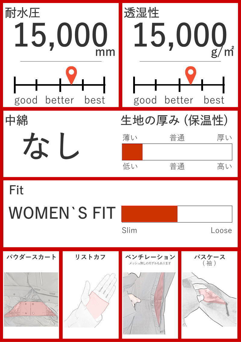 ・耐水圧:15,000mm ・透湿性:15,000g ・中綿:なし ・FIT:WOMEN`S FIT ・4-Wayストレッチ 2レイヤー構造生地 ・テープ処理がされたシーム ・2-Way撥水ジッパー ・新設計エルゴノミック調整フード ・メッシュ裏地付きジッパーベンチレーション ・ウエストゲイター ・メッシュゴーグルポケット ・起毛トリコットポケット裏地 ・メディアポケット ・裾に隠しバンジーコード ・クイック収納スリーブパスポケット ・ストレッチリストゲイター ・調節可能リストシンチ ・ウェストのパウダーガード:あり ・手首部分のカフ:あり ・脇の下のベンチレーション:あり ・パスケース:あり(袖) ・生地の厚さ:やや薄い |