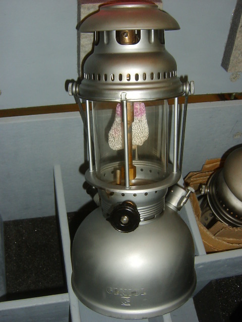 ペトロマックス社製ランタンHK250の2個セット。このセットは1個がゲニオール刻印です。 豪華な木箱には純正のリフレクターが2個、パッキンやニップルなどの入った小箱やジョーゴ、などなど。残念ながら本来のセット品の予備のホヤが欠損です。 とりあえず圧がかかりエアーが出るのは確認しましたが漏れや詰まりなどに関してはノークレームでお願いします。当然マニア向けのランタンです、初心者の方は入札しないでください。 沖縄離島を除く1000円にてお送りいたします。落札価格にプラスでお願いいたします。キャンプ用品
