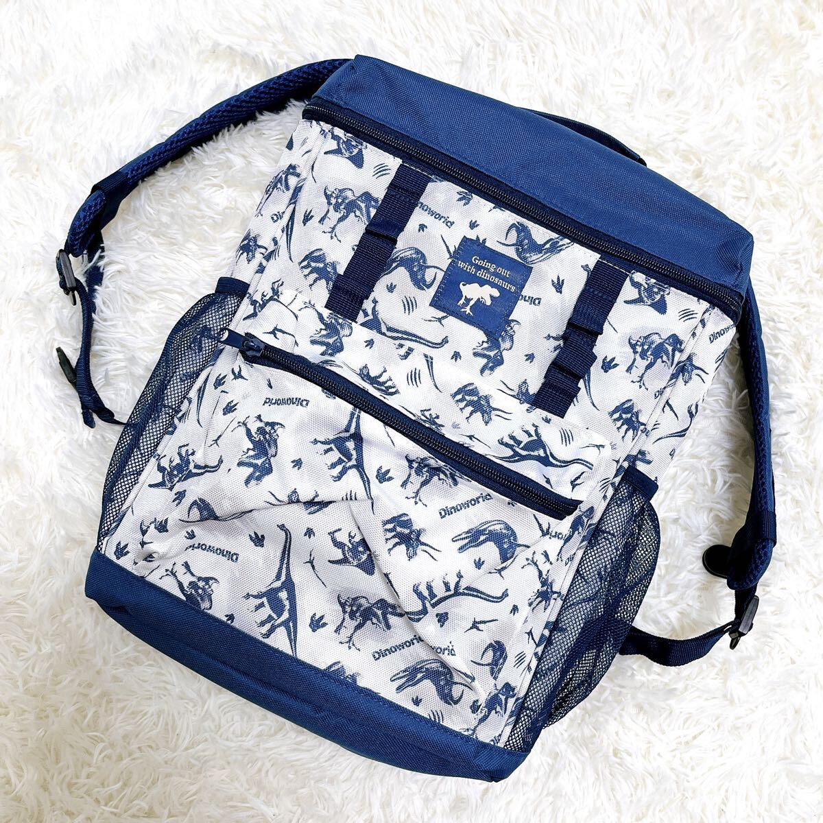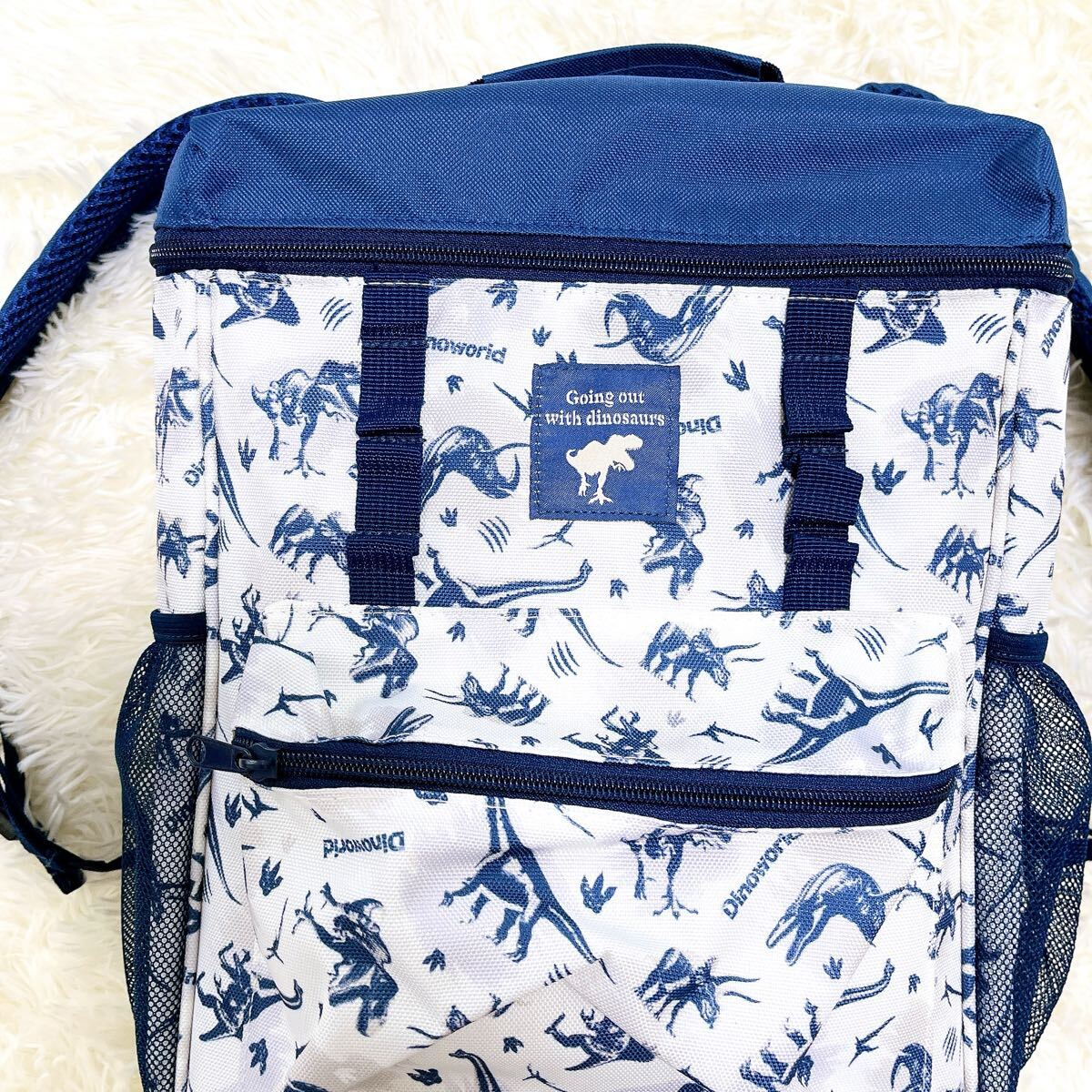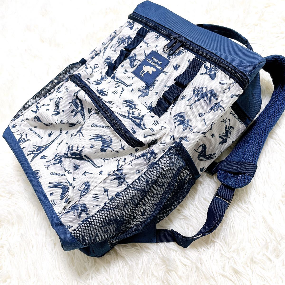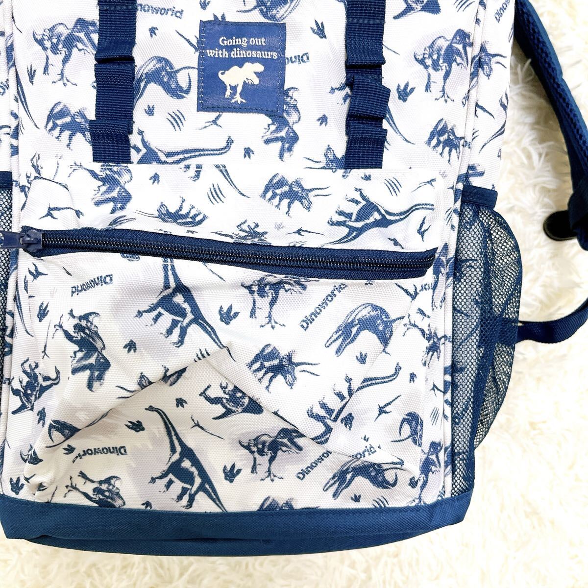 スクエアリュック/リュック/リュックサック/ディノワールド/車/恐竜/総柄/子供/子ども/こども/キッズ/男の子/男児/青/ブルー/ネイビー/紺色/白/白色/ホワイト/バッグ/カバン/かばん/鞄/新品/未使用/美品/タグ付/タグ付き/タグあり/タグ/小学生/幼稚園/保育園/遠足