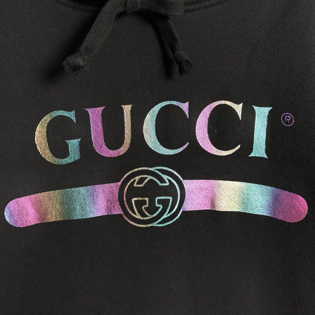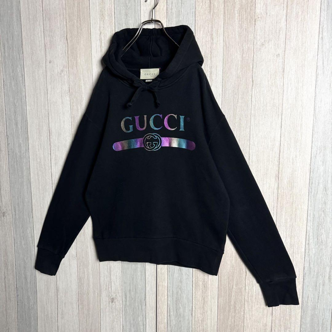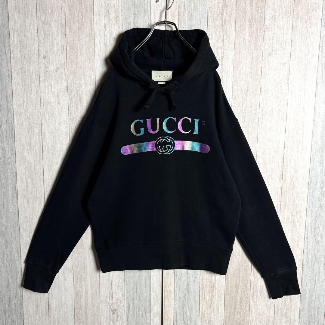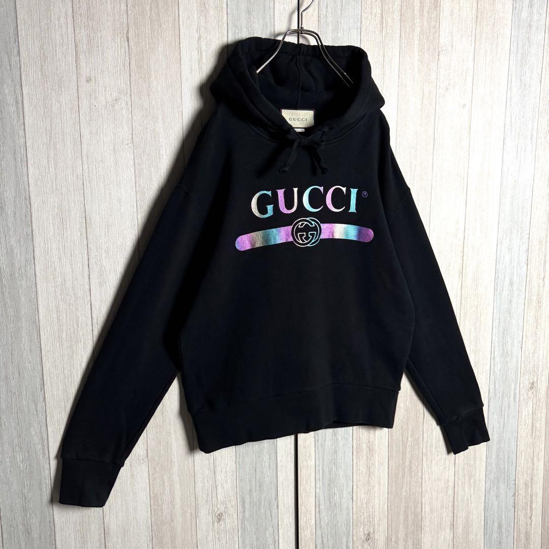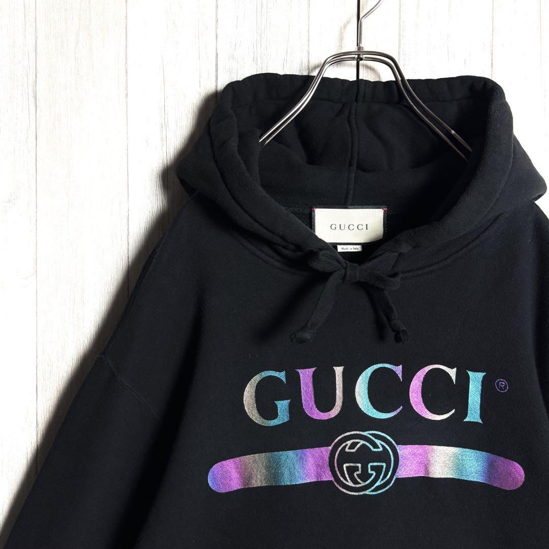 【希少デザイン・美品】イタリア製 GUCCI グッチ オーロラ センターロゴ インターロッキング スウェット パーカー ブラック・黒 実寸L相当