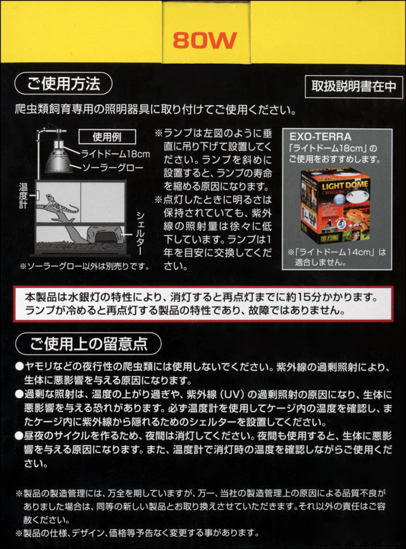 ●ヤモリなどの夜行性の爬虫類には使用しないでください。紫外線の過剰照射により、生体に悪影響を与える原因になります。