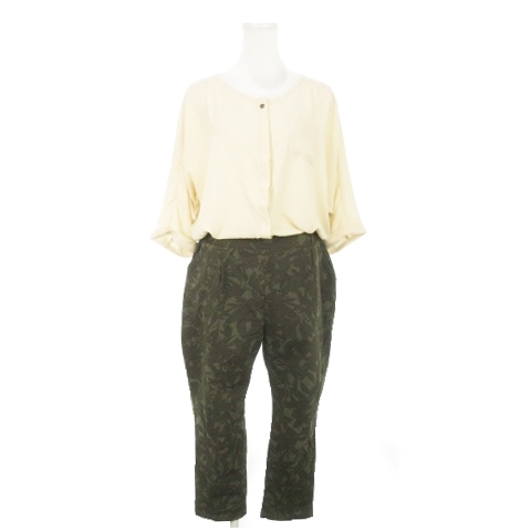 【仕様】素材 トップス部分薄手 パンツ部分やや厚手 開閉 ハーフボタン 伸縮性 パンツ部分ややあり 透け感 トップス部分あり ポケット 左胸×1 パンツ部分×2 裏地 パンツ部分あり 柄 切替 花柄 ボタニカル ウエストバックゴム