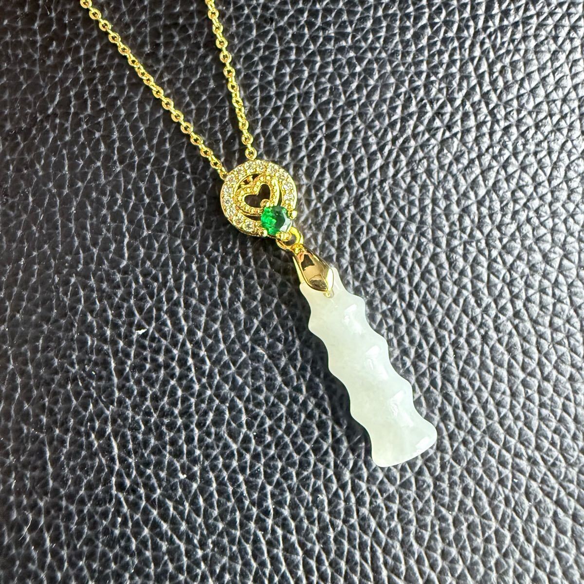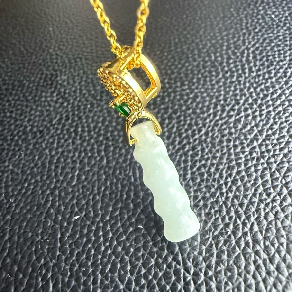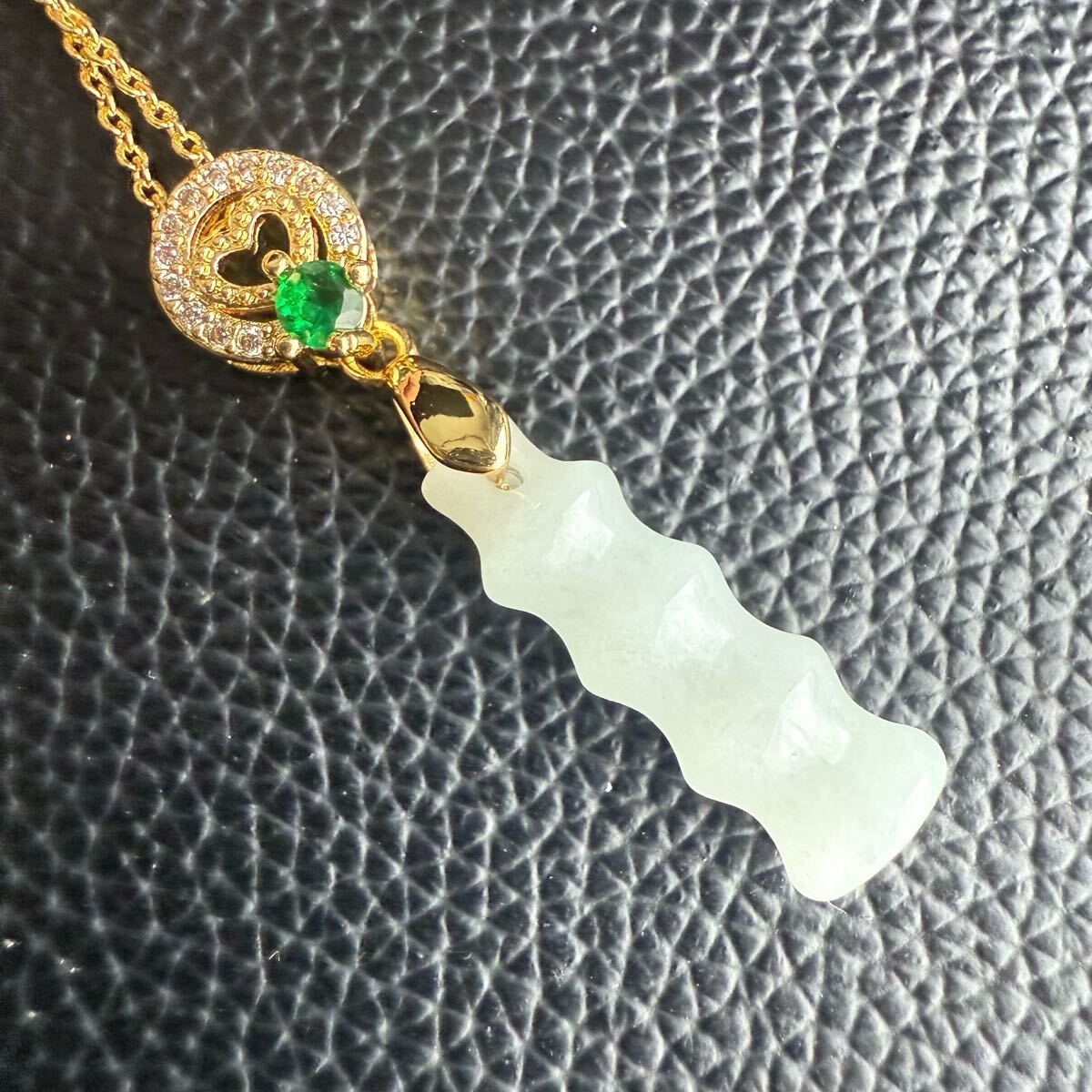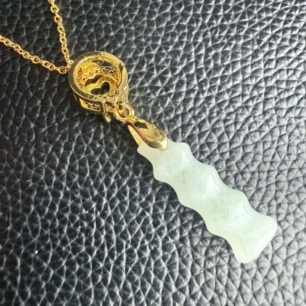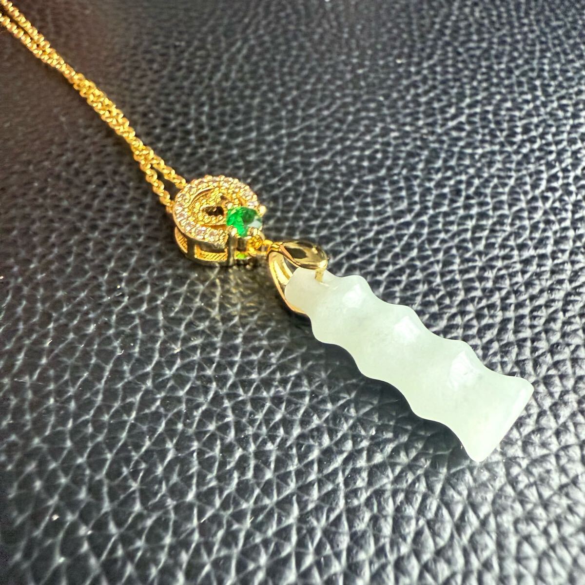 爽やかな淡い緑色の翡翠を竹節の形に彫刻し、金色の枠と煌めく装飾で華やかに仕上げました。