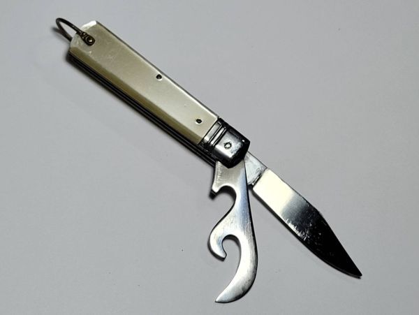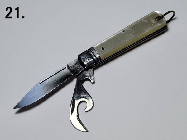 21.昭和時代の折りたたみポケットナイフ 栓抜き・缶切り付 ステン鋼 ハンドルホワイト 昭和30年代~40年代 未使用品 デッドストック