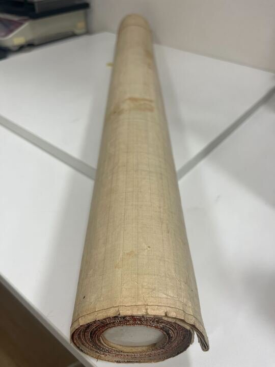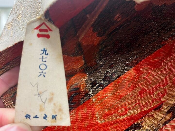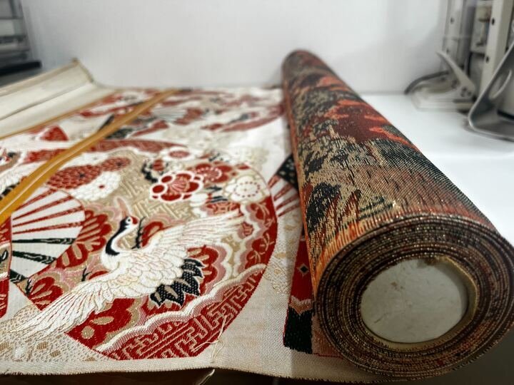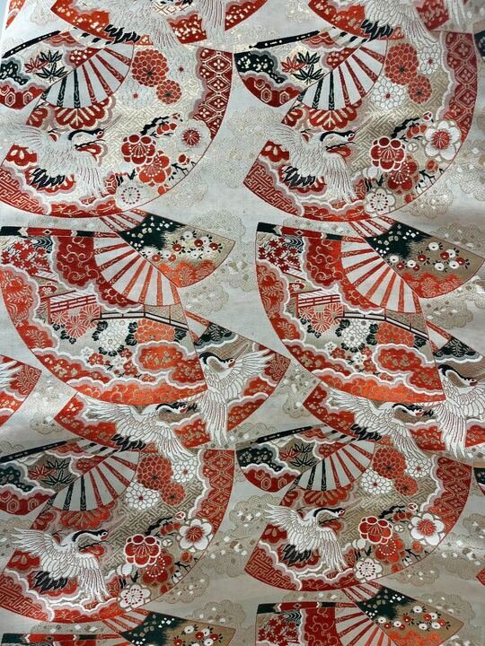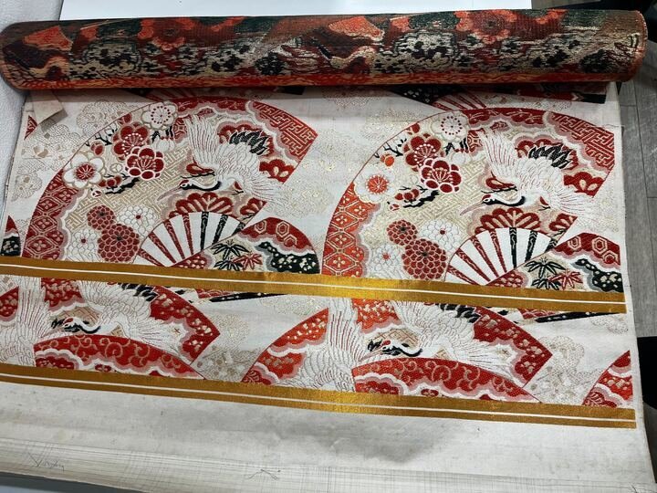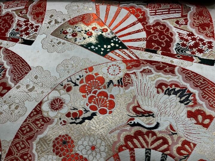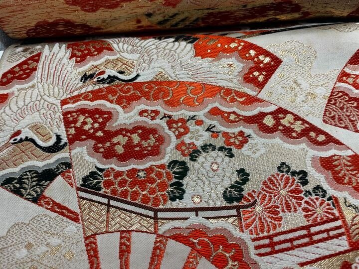 【J79847】反物 丸帯 扇 鶴 花柄 400×69cm レトロ 古典柄 |