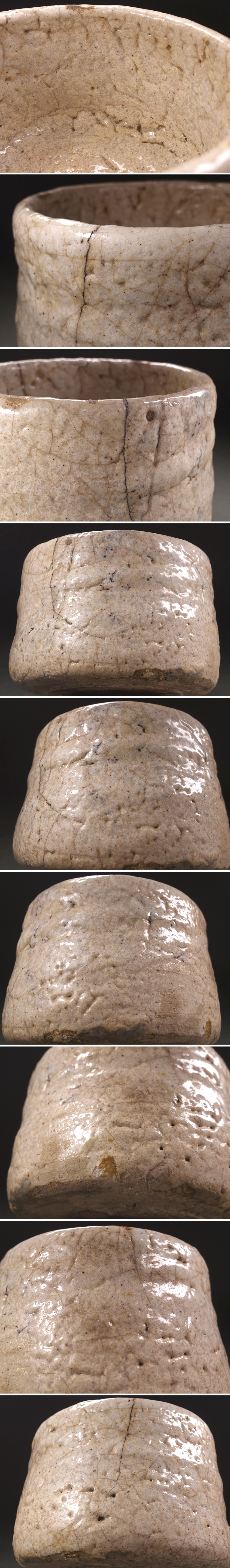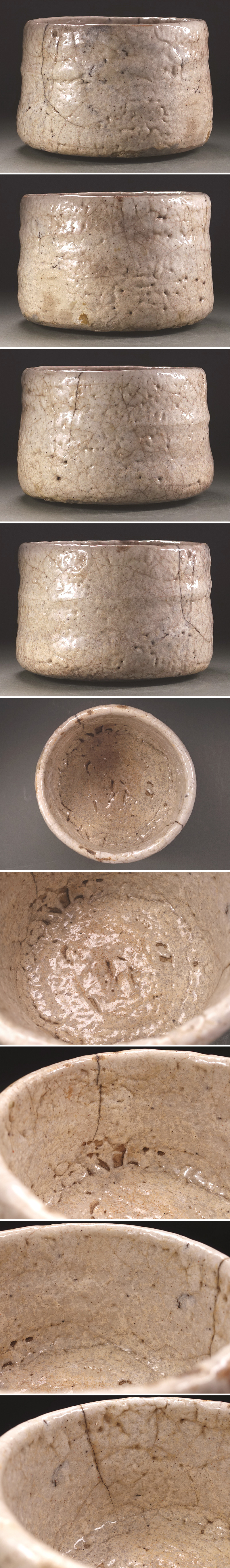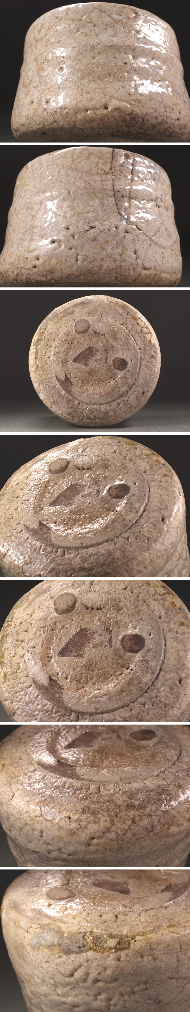 【状態】   古いお品ですので、釉の風化による剥落が御座います。特に高台から腰にかけてが顕著です。強く擦る・乱暴に置く等、衝撃を加えると剥落してしまいますのでお取り扱いの際はご注意下さい。 全体としては口縁のニュウ、腰の大きな直し(釉の剥落を防ぐためと思われます)、些細なスレや汚れ等の経年感は見受けられますが、致命的な傷みは無く、まだまだ良好な状態です。