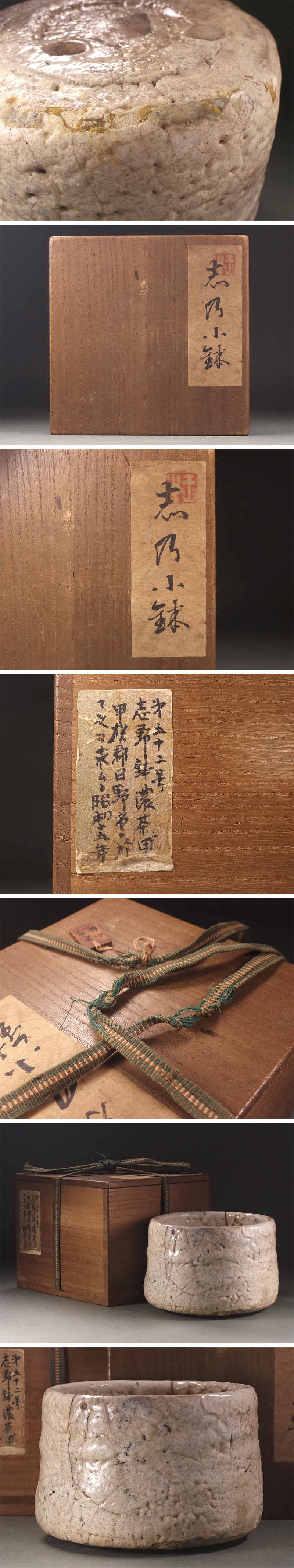 添えられた箱の蓋表と側面にはそれぞれ貼紙が施され、詳細は不明では御座いますが蓋表のものには蔵印が確認でき、また側面のものには「第五十二号 志野鉢濃茶用 甲○郡日野○二於テ之ヲ求ム・昭和十五年」と記されていることから昭和15年(1940年)に前蔵者が手にしたことが分かります。