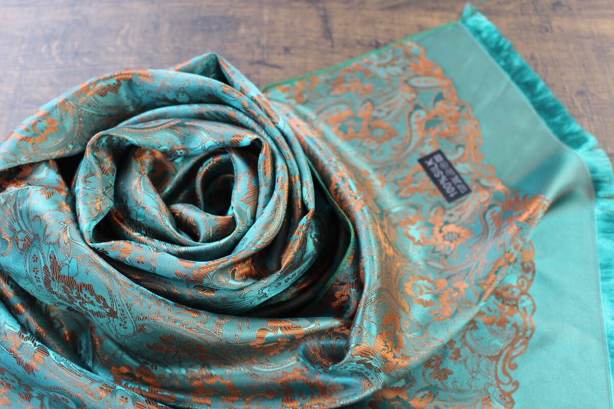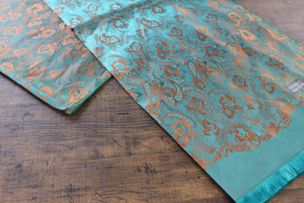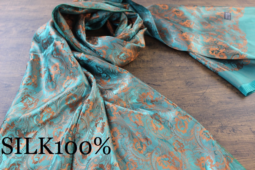 新品【シルク100% SILK】ペイズリー花柄 シャイングリーン×シャインオレンジ 緑 GREEN ORANGE 大判 ストール/スカーフ