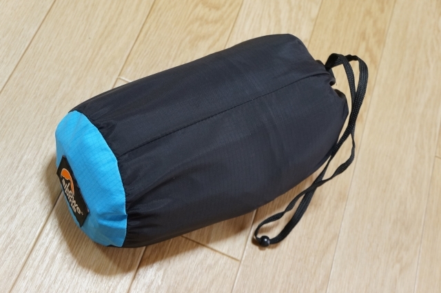 フードは丸めて襟に収納できるタイプ、スタッフバッグ付きです。