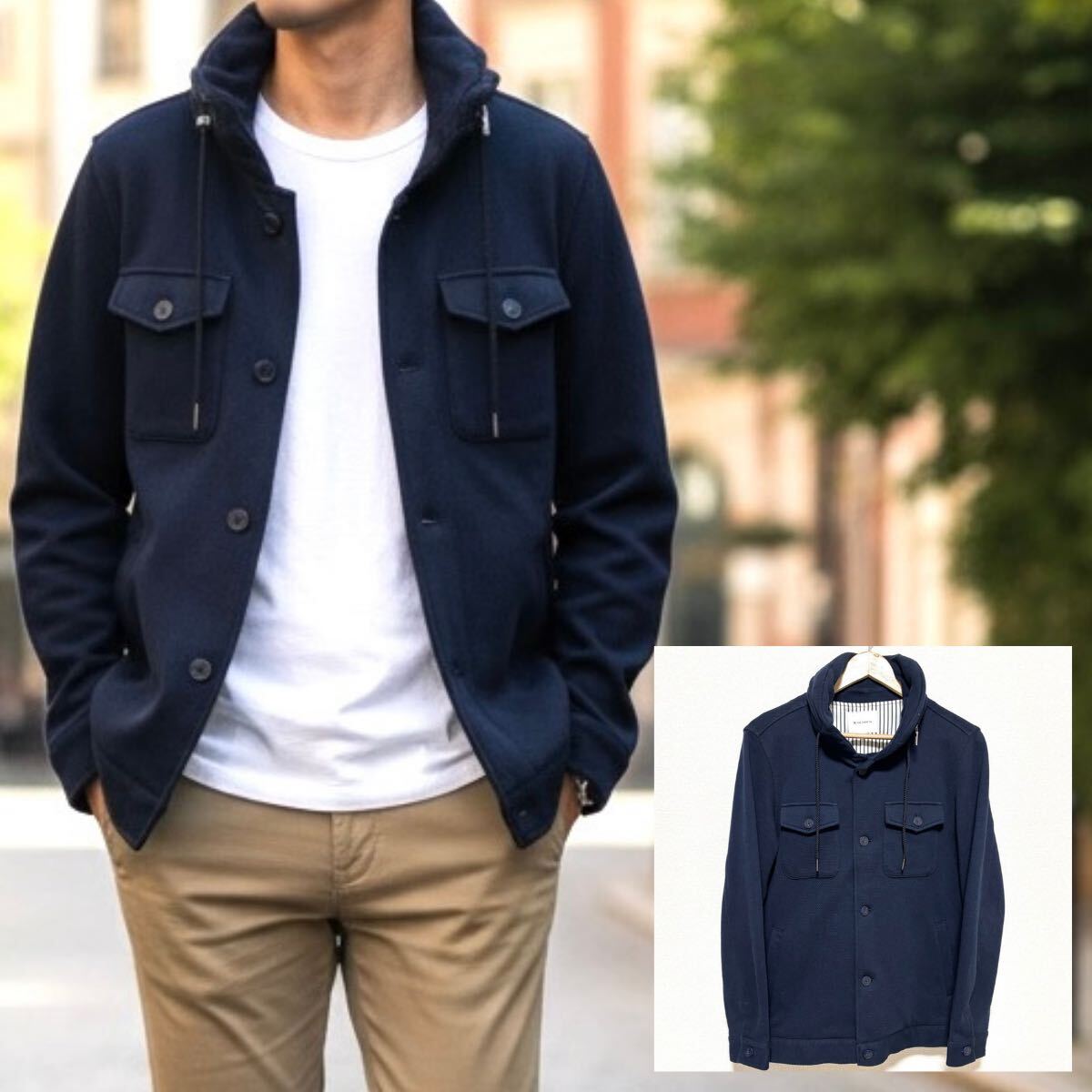 ボタンとポケット、襟が特徴のジャケットになります。シンプルながらきちんときまるデザインで、好印象の着こなしが可能。これからの季節にぴったりのアウターです。