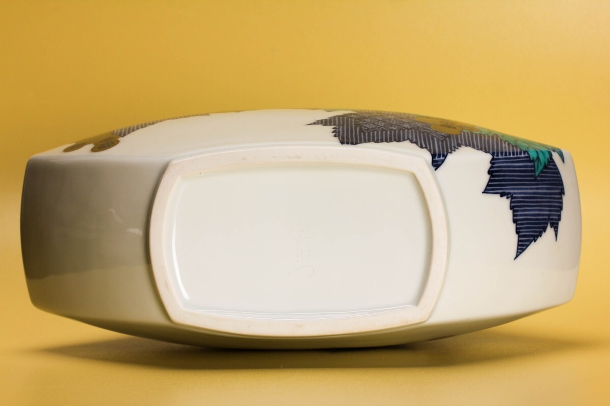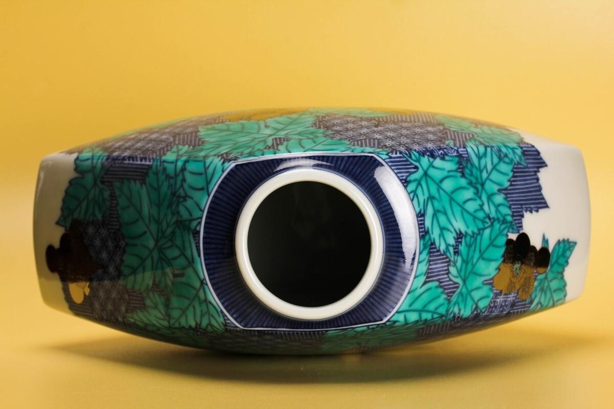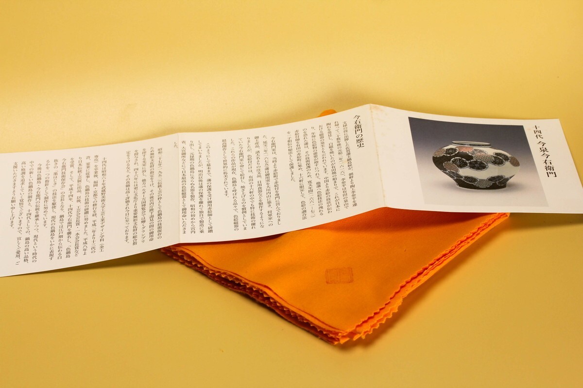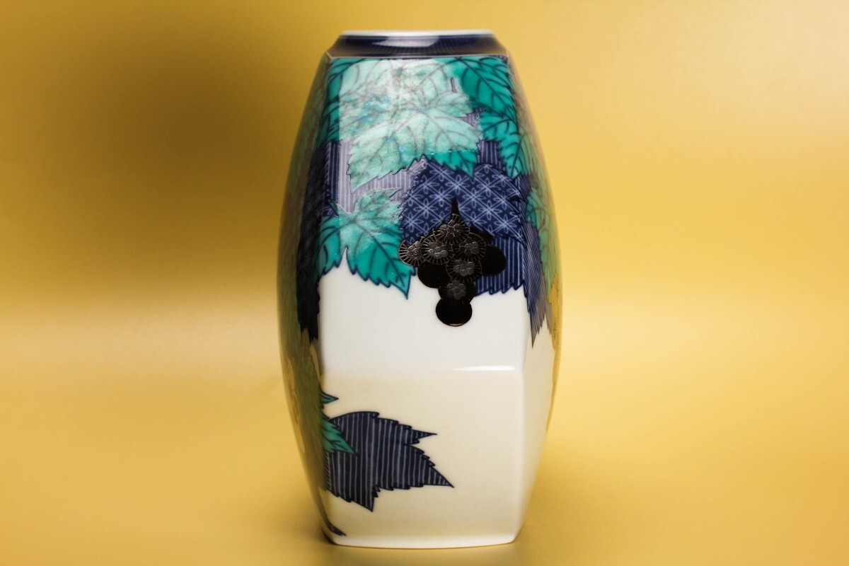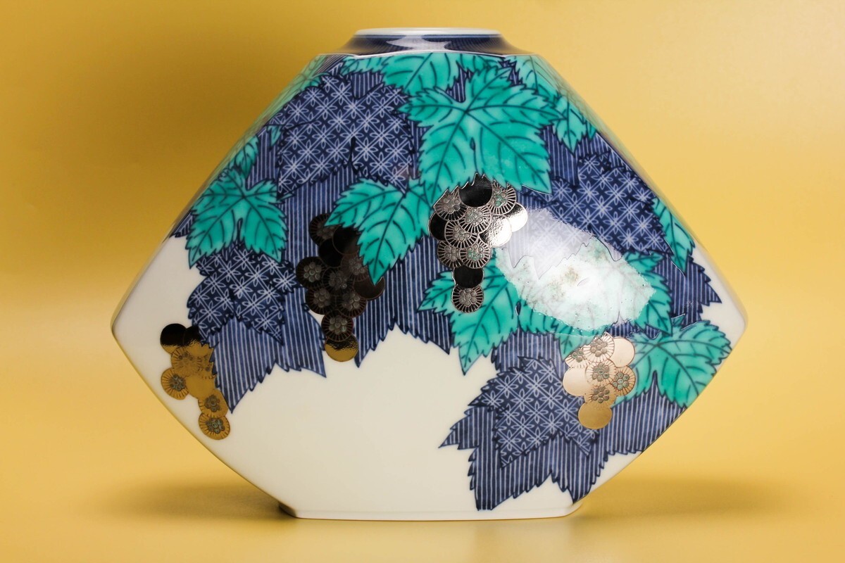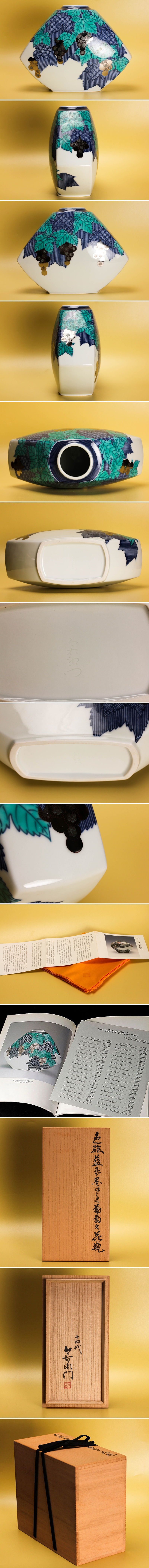 人間国宝 十四代 今泉今右衛門 本人作 幅26cm 色絵藍色墨はじき葡萄文花瓶 個展出品作同手 共箱 共布 栞 本物保証