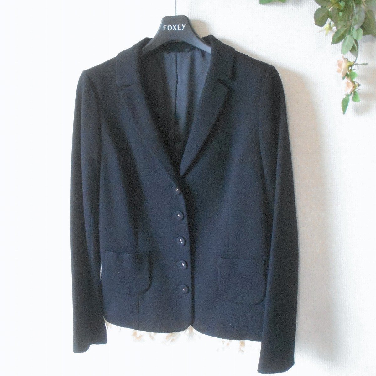 【ポイント】フランシュリッペブラックのレディース用ジャケットになります。お色は黒色ベースで秋冬を中心に着ていただけるお品です。5つボタンのテーラードで裾にはレースが使用された、とっても素敵なデザインです。