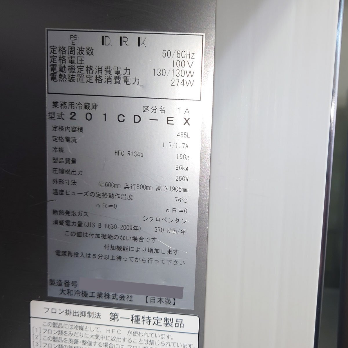 【 型 式 】 201CD-EX 【サ イ ズ】 幅600×奥行800×高さ1905(mm) 【 重 量 】 約86kg 【 電 源 】 単相100V 50/60Hz 【 定 価 】 1,043,000円(税抜) 【 年 式 】 2021年製 ・有効内容積 485L ・設定温度 -7~12℃ ※キズ・凹み複数あり |