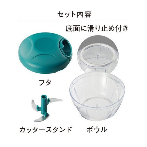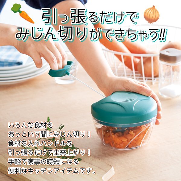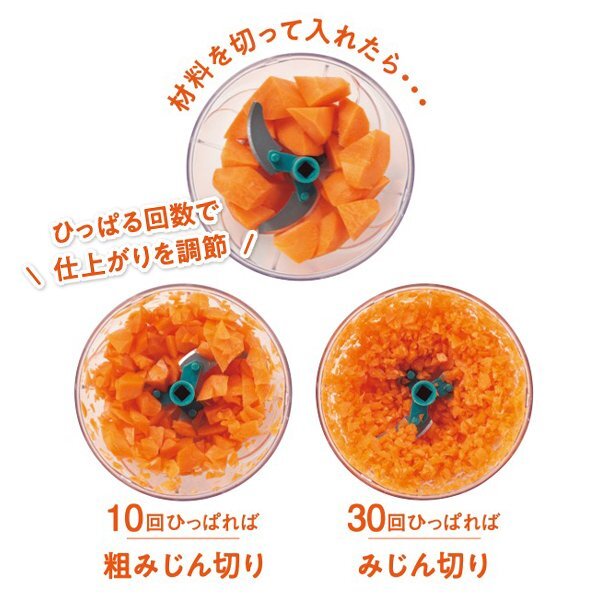 | ハンドルを引っ張るだけでみじん切りが簡単♪ ハンドルを引っ張る回数を変えて、出来上がりの細かさを調節☆ |