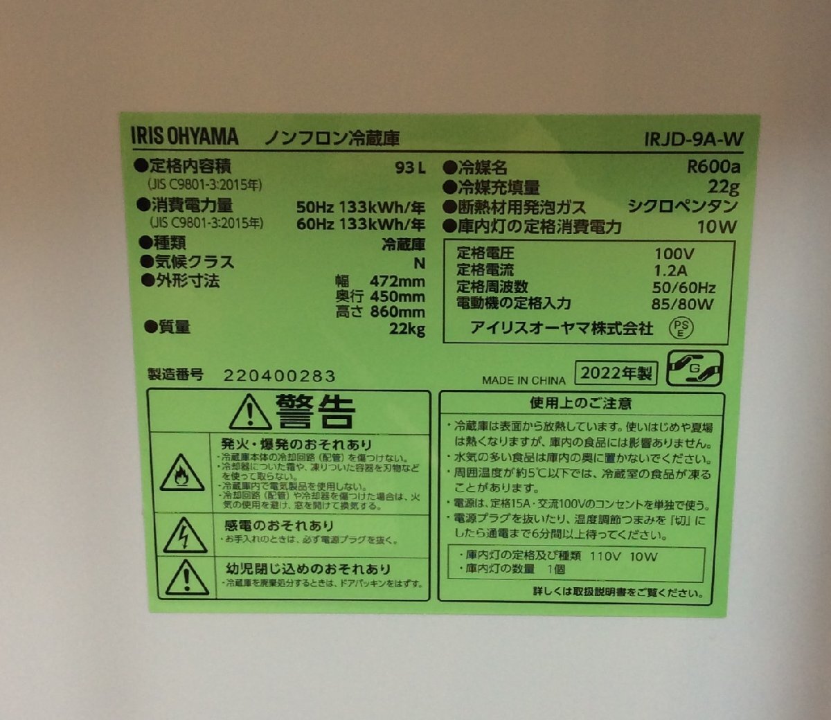 ◇1人暮らしや2台目として最適な1ドア冷蔵庫(93L)。冷蔵室にはガラス棚とクリアケースが付いて使い勝手がよく、6段階の温度調節が可能。ドアポケットが3段あり、各ポケットには500ml缶・350ml缶・2Lのペットボトルが入る。庫内に冷却器があり、氷を作ることができる。庫内の棚は取り外し可能なので鍋など大きいものが保存でき、掃除も楽。シンプルでコンパクトなため、置き場所に困らない。 <商品について> ■メーカー:アイリスオーヤマ ■型番:IRJD-9A-W ■タイプ:冷蔵庫 ■ドアの開き方:右開き ■ドア数:1ドア ■定格庫内容積:93L ■サイズ:幅472x高さ860x奥行450 mm ■質量:22㎏ ■説明書:なし ■付属品:画像のものですべて ※扉に小さな凹み、小キズがあります。 ※庫内カドに小さな汚れがあります。 <コンディション> こちらの商品は、中古品のため、使用に伴う小傷や汚れがあります。扉の凹みに関してはペン先ほどの大きさで近づくと確認できる程度です。 動作確認済みのお勧め商品です。 |