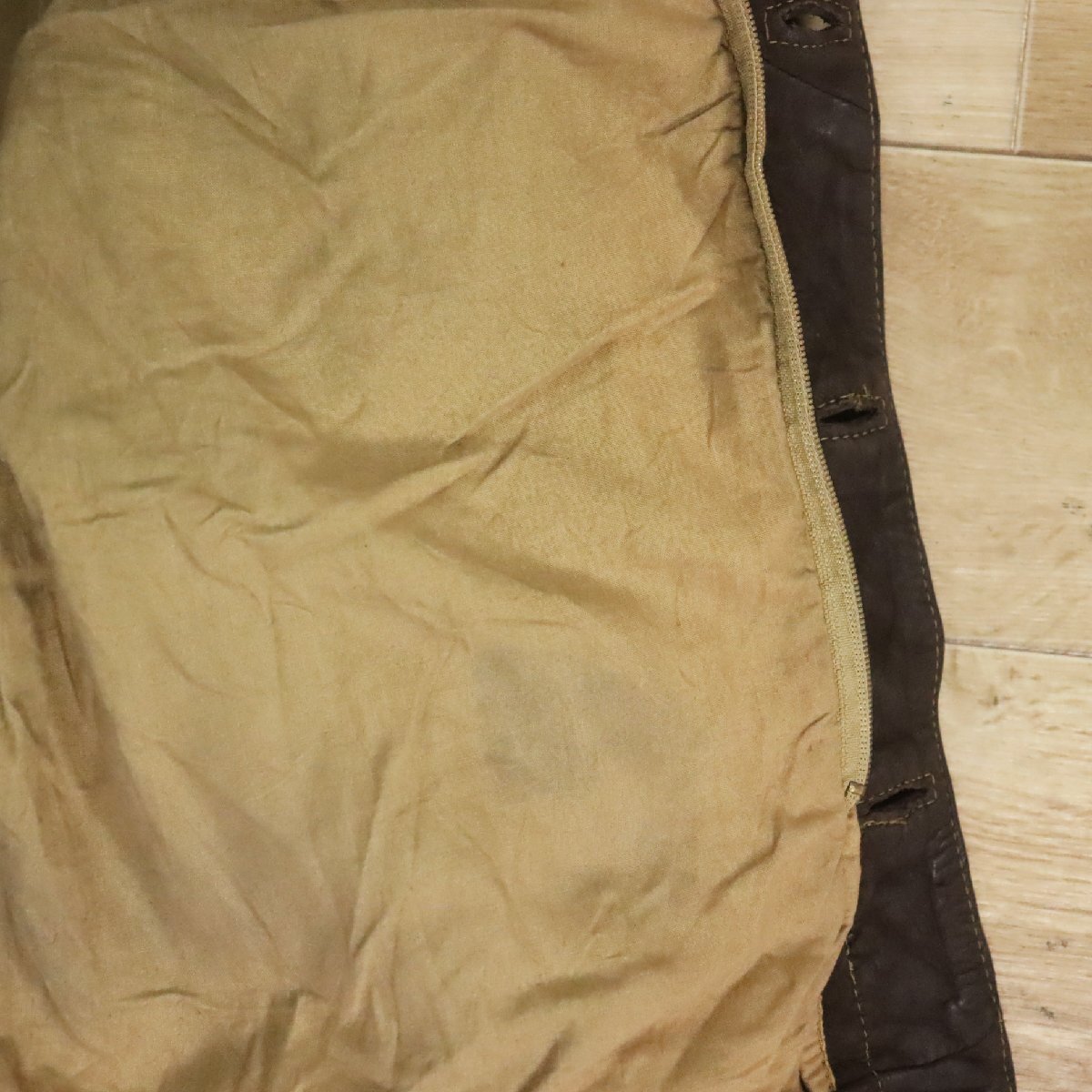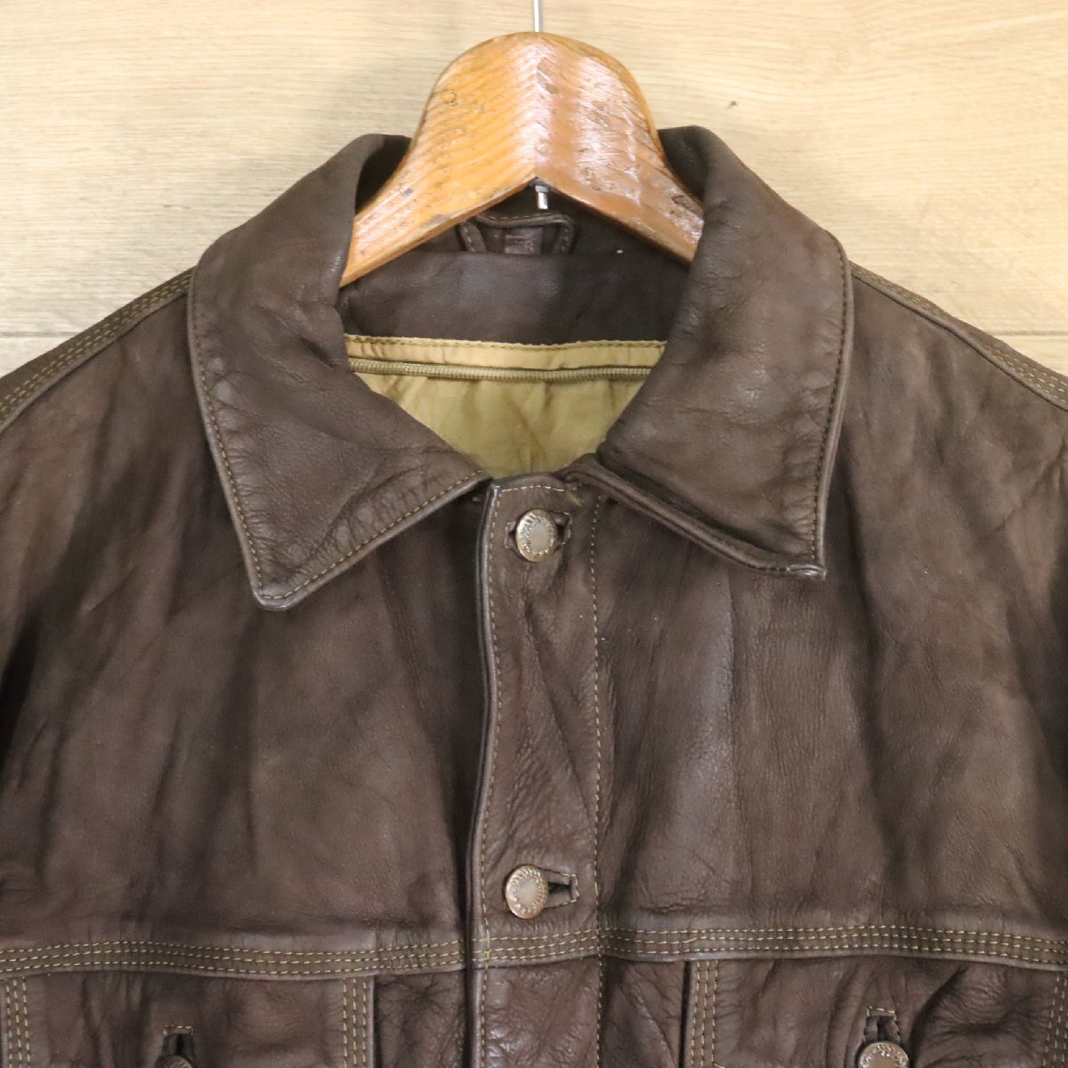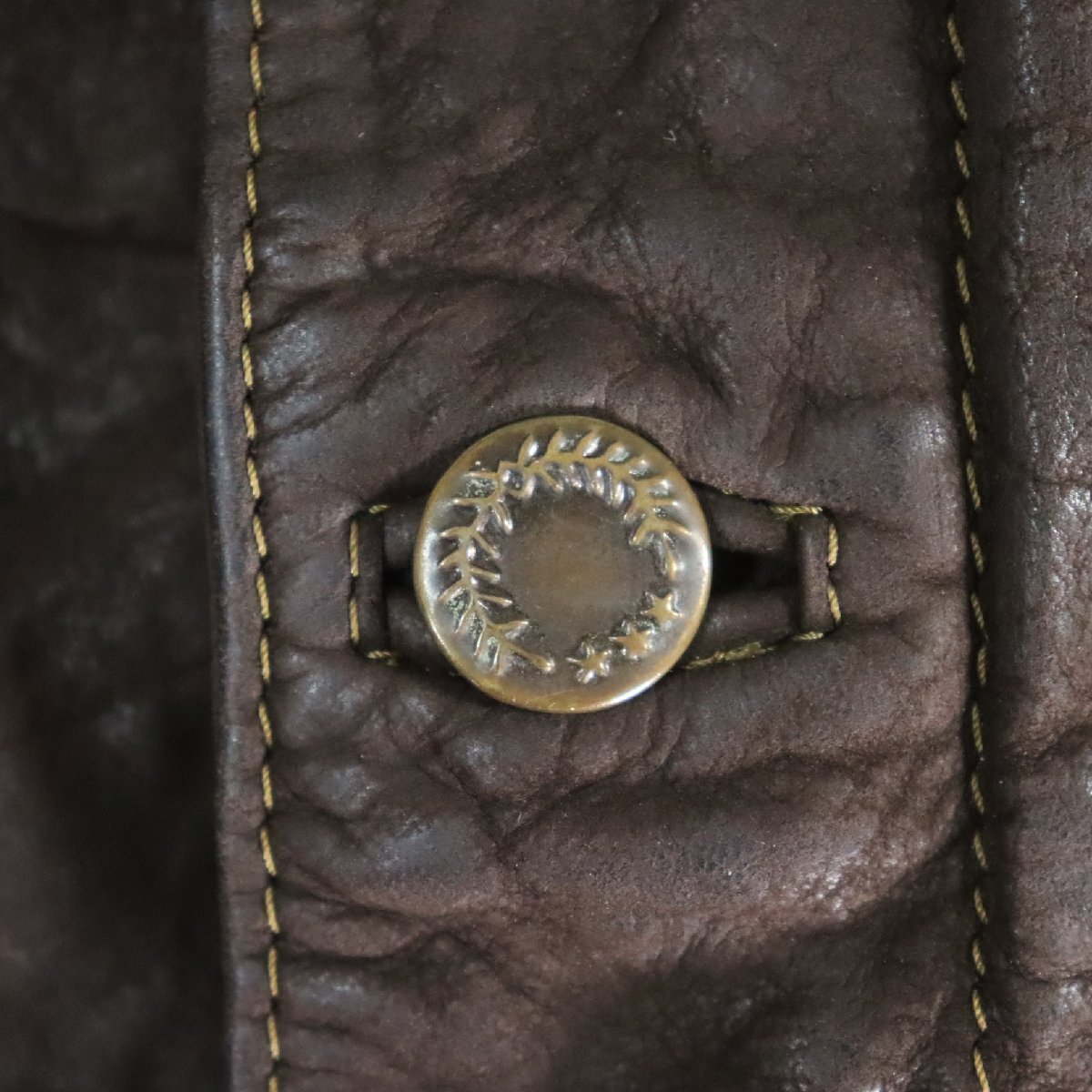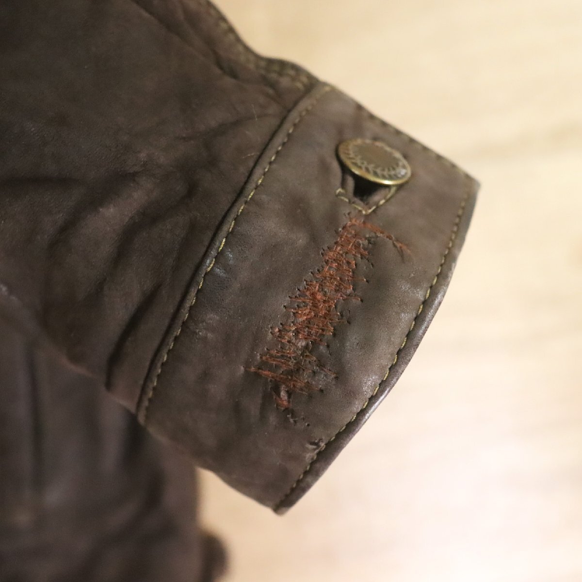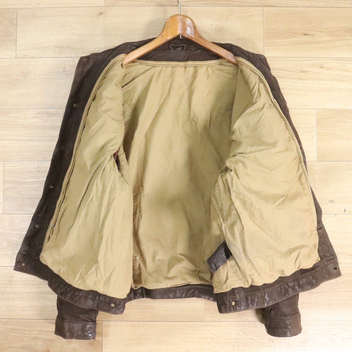 中古品です。使用感があります。経年によるレザー特有の擦れと薄汚れ、裏地に薄汚れ、左袖にリペア跡があります。付属のライナーはありません。
