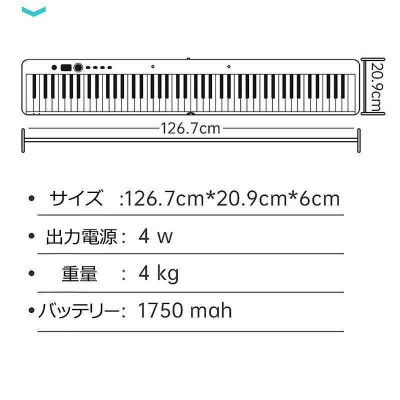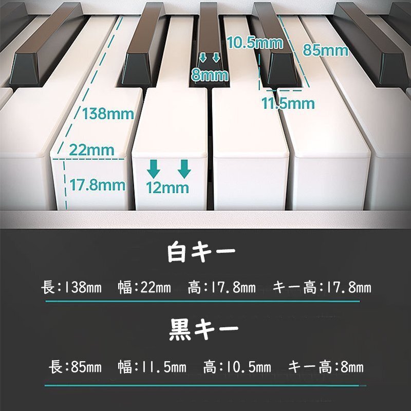 【本格的な弾き心地】黒鍵:12mm(幅)、8mmストローク 白鍵:22mm(幅)、10mmストロークで、生ピアノと同じサイズの88鍵盤を搭載し、独自開発したハンマー感技術により、低コストでハンマーに似たタッチ感を実現していますが、タッチ感を軽い設置で初心者にも、携帯練習にも適しています。また、白鍵盤は象牙調仕上げで長時間の演奏で指が汗ばんでも滑りにくく、グランドピアノに近い弾き心地を実現しました。