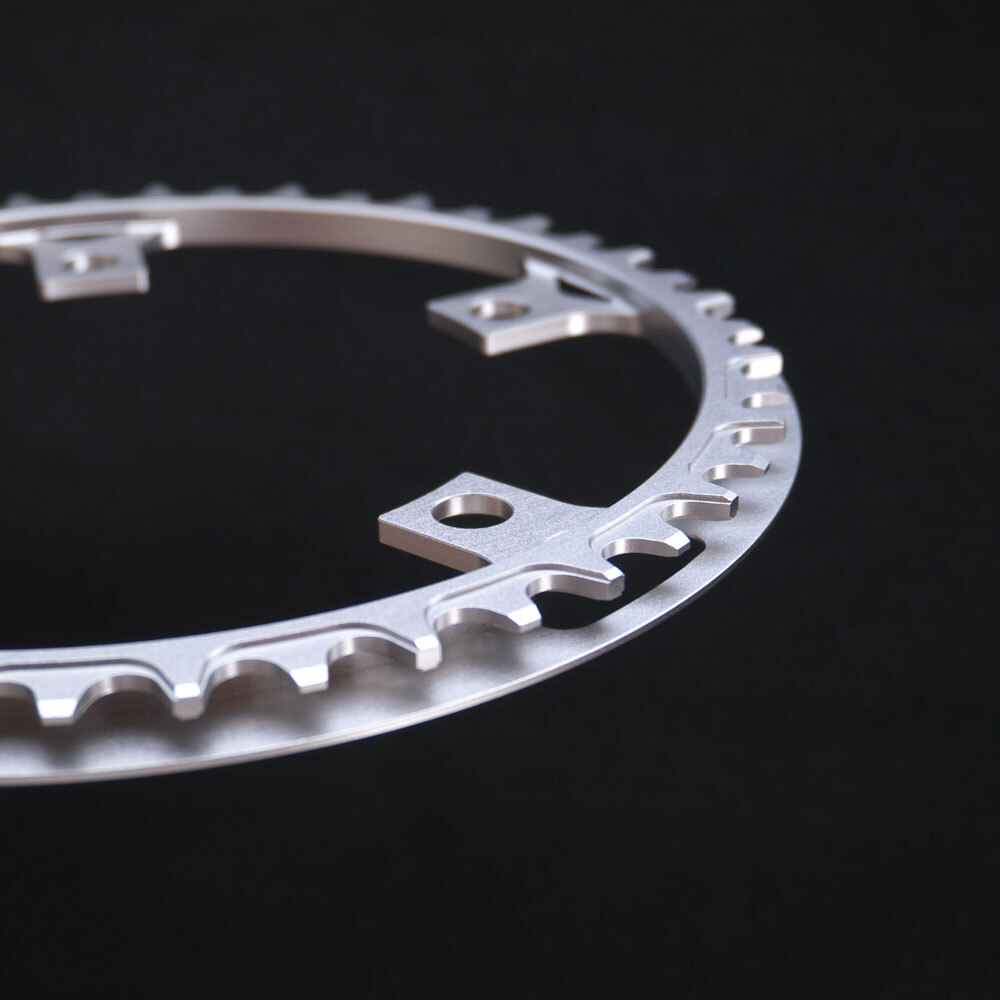 このガード付きナローワイドチェーンリングの特徴としては、チェーン落ち防止や裾の汚れ防止のほか、ガード外側がツライチの造りで歯先自体は少し内側に入るため、ダブルのクランクでアウター側に取り付けたときに、チェーンラインが適正位置に近づくというメリットがあります。