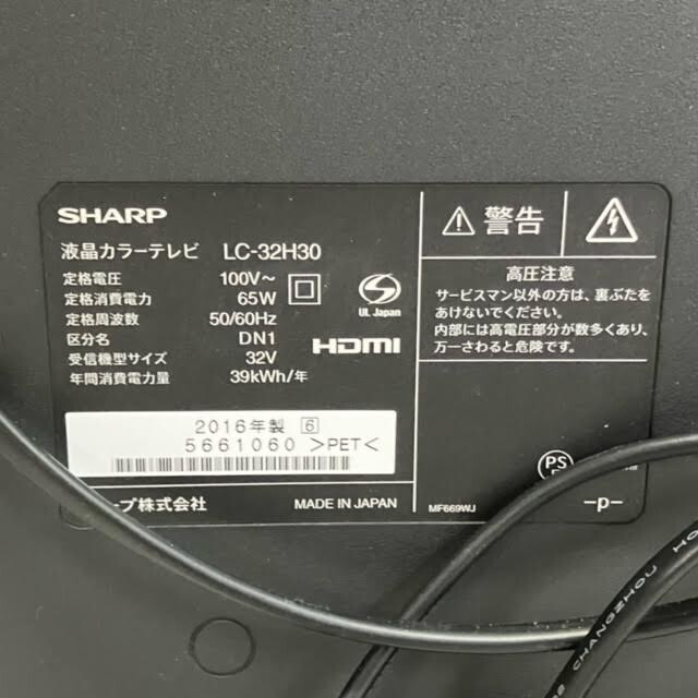 仙10 SHARP AQUOS LC-32H30 32インチ 液晶カラーテレビ 2016年製 リモコン付き シャープ アクオス テレビ 映像機器 ※スタンドのネジ欠品