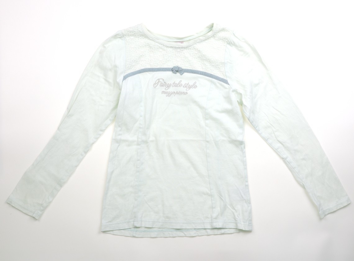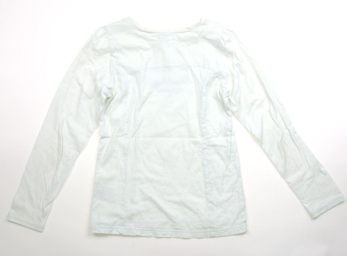 Lサイズ表記。首回りと袖口に黄ばみ・肘の広範囲で茶色汚れあり。