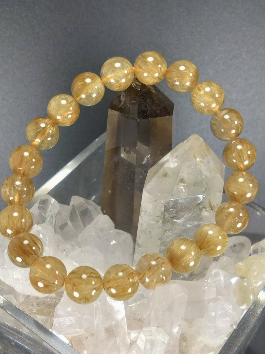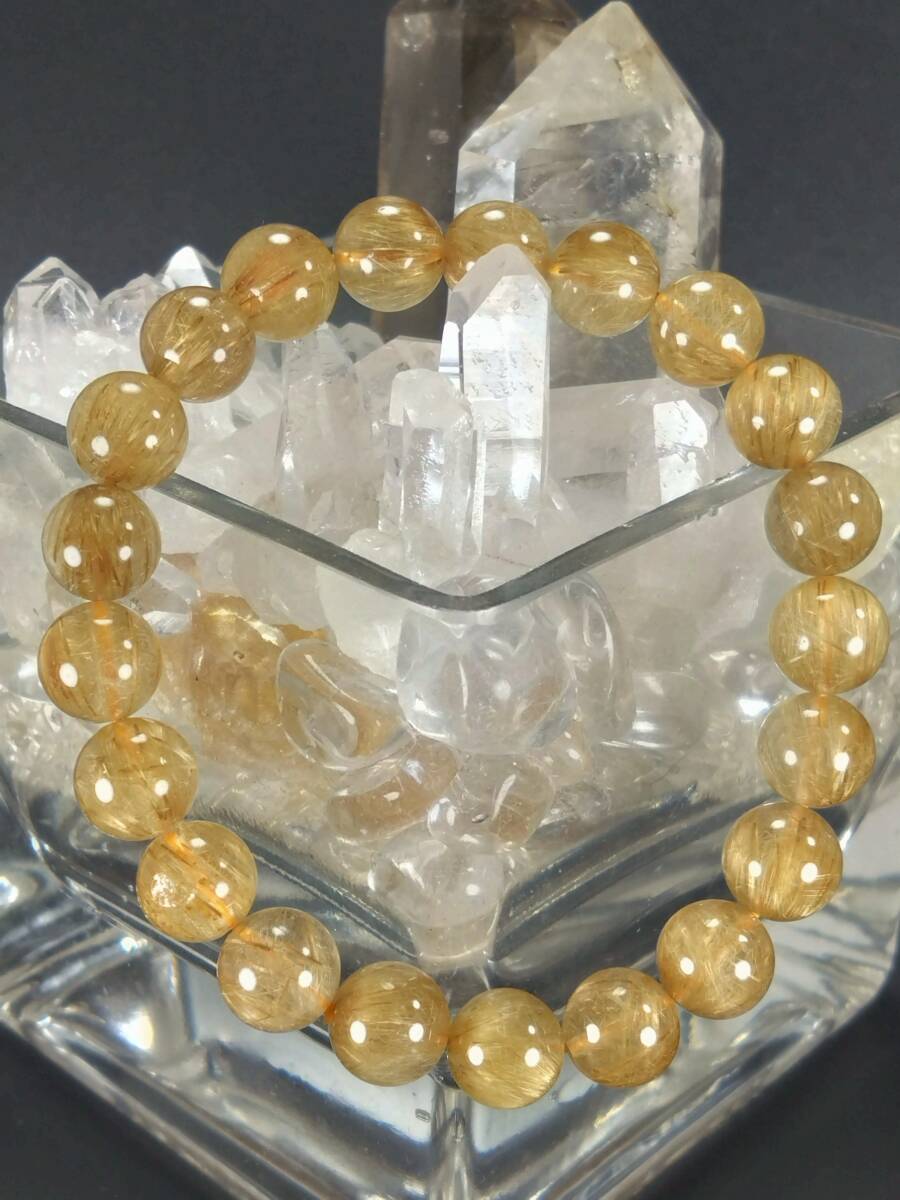 今回のブレスレットは通常のルチルインクォーツよりワンランク上のタイプになります タイチンルチルや細かいルチルが一定方向に流れて入る事により光のシラーが綺麗に現れ見る人を魅了する天然鉱石を堪能いただける逸品になっています 色も見事な金色なので本当に楽しめるブレスレットです 脱着もゴム式なので楽々です (ワイヤー式に変更可能です)