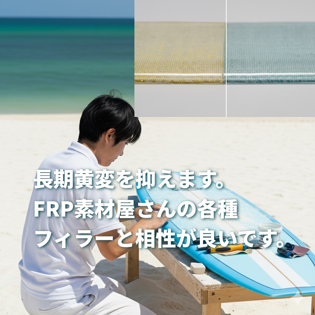 インパラタイプ: 最終層にパラフィンを添加する必要なし。硬化剤のみで表面がしっかり硬化し作業が簡単に行えます。硬化後は薄いブルーで非常に高い透明度です。自然で目立たない補修が可能紫外線による黄変や劣化に強く、透明度と強度を長期間保ちます。優れた透明度で、下地をクリアに見せます。気泡が入りにくく、光沢のある仕上がりを実現します。 使用方法とメリットこのレジンは、PUボードの傷やへこみ、フィンボックス周りの補修などに使用できます。硬化剤と混ぜてガラスクロスを併用し強度を高められます。初心者も扱いやすい粘度と硬化速度です。FRP素材屋さん推奨製品軽量化・パテ充填:ガラスバルーンを使用耐摩耗性: アエロジル#200を使用ガラスクロス: ガラスクロス6oz、4ozに最適 注意事項PUボード専用で、 EPSボード(ポリスチレン)は溶けるため使用不可です。製造メーカー: トマト工業株式会社