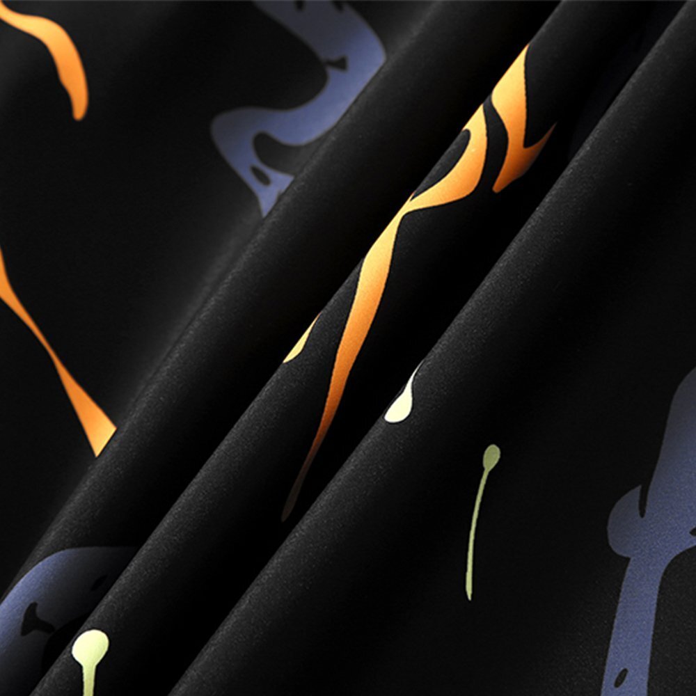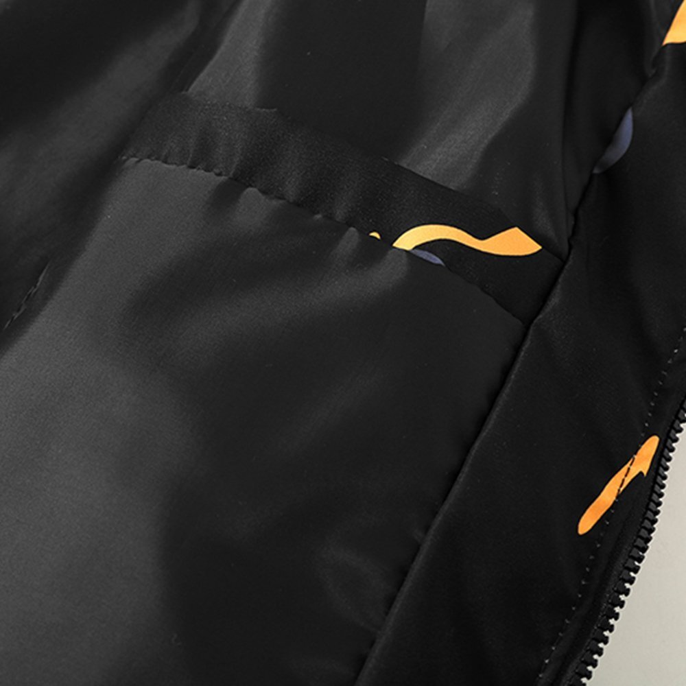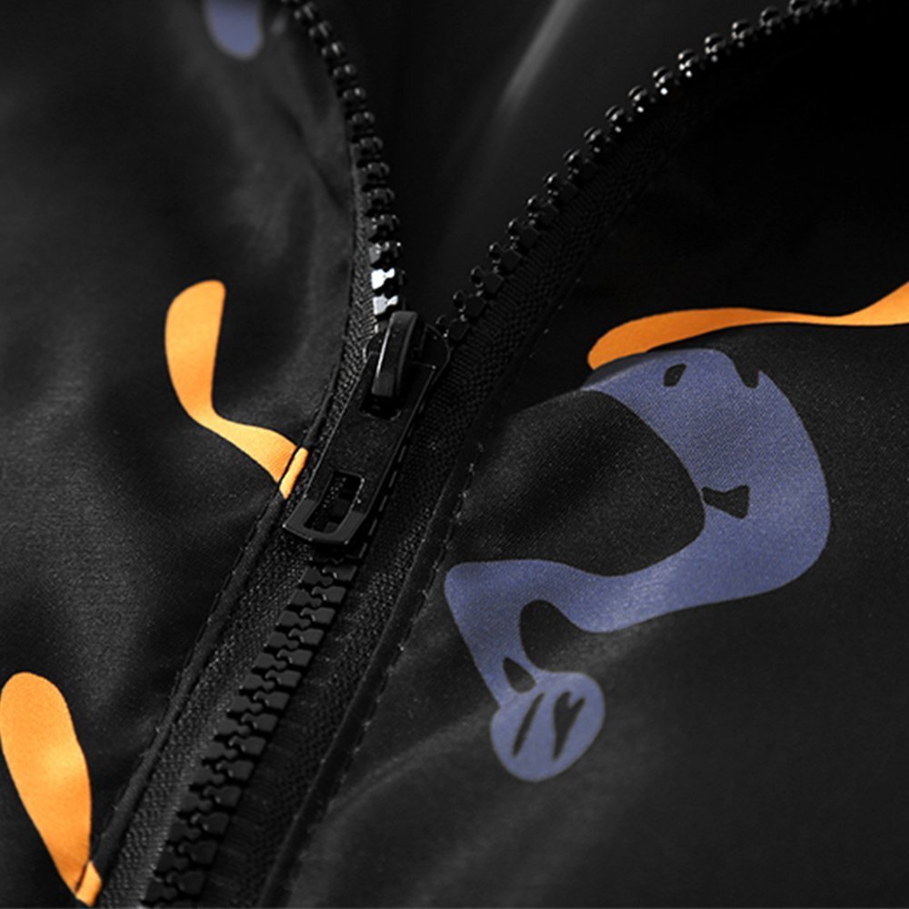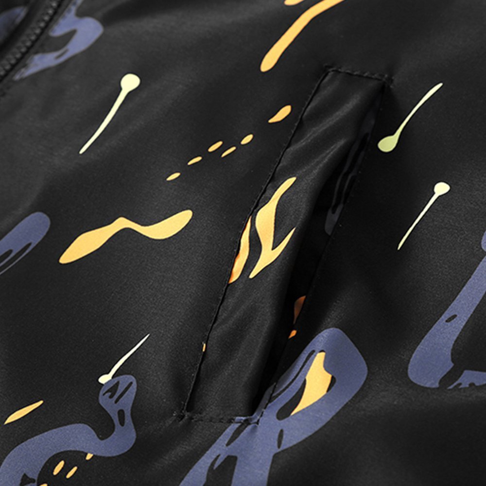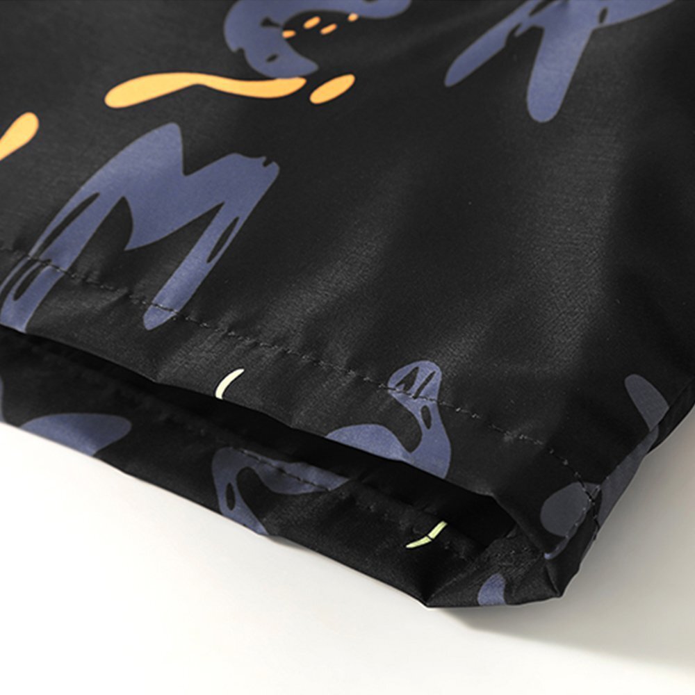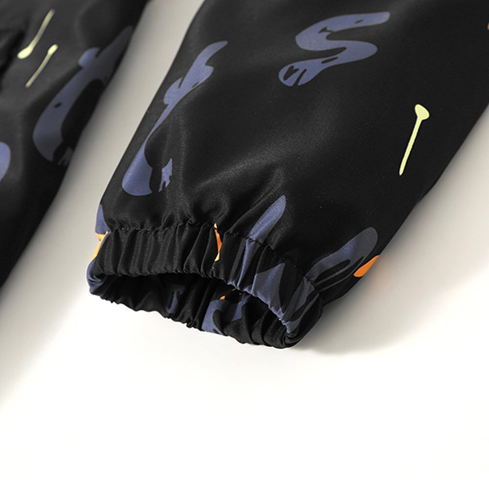 全体に施された落書き柄や英字プリントが、ストリート感を演出し、個性的で遊び心あふれるデザインが魅力。袖口はゴム仕様なので風の侵入を防ぎつつ動きやすさも確保しています。両サイドポケット付きなので、携帯電話やカードケース、鍵やタオルなどの小物を収納できて身軽に動けます。