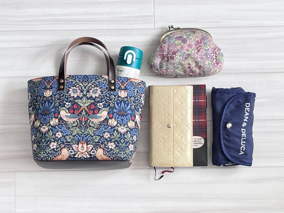 ハンドメイド+ウィリアムモリス+いちご泥棒+爽やか+ブルー+青+いちご+鳥+Mサイズ+ころりん+トートバッグ +本革