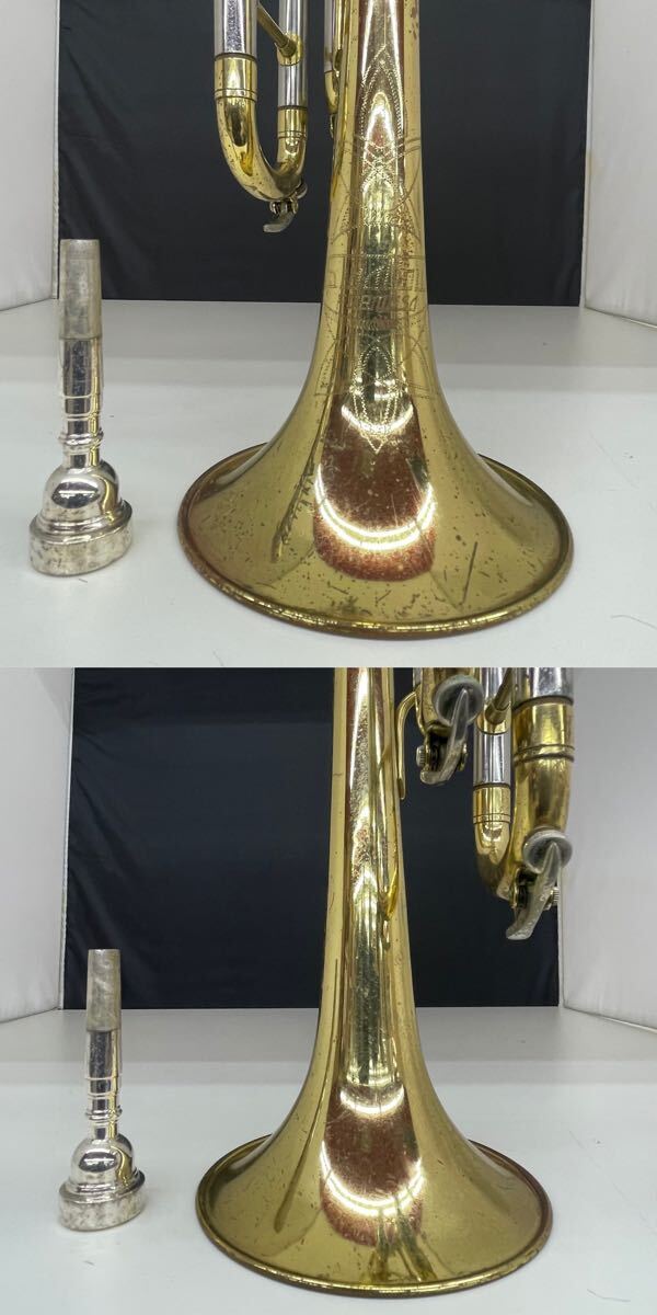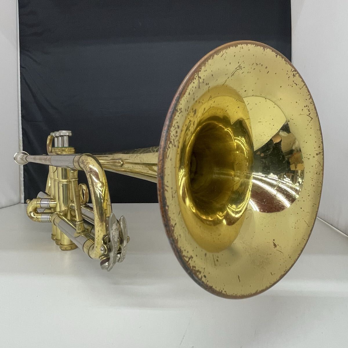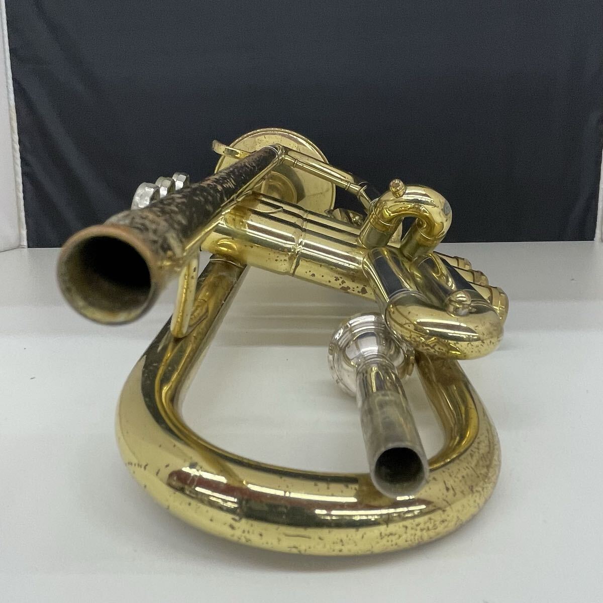 全体的に傷、錆が多く、箇所によって凹みもあります。指掛リングは若干変形しています。また主管抜差管は固着しています。ベルには多数傷がありますが、凹みや歪みはないようです。