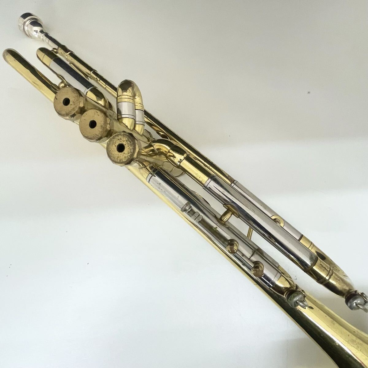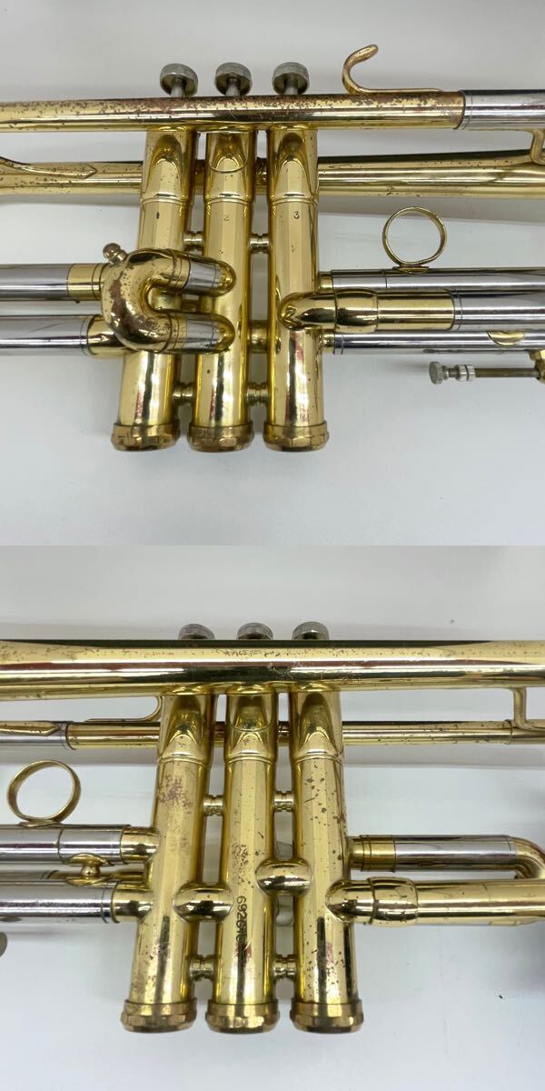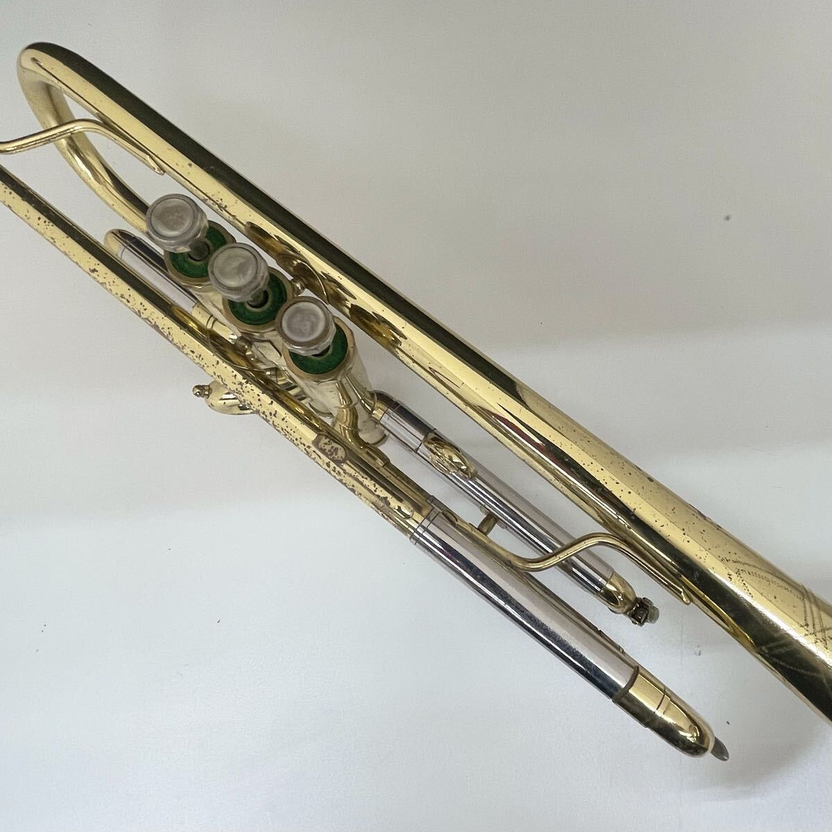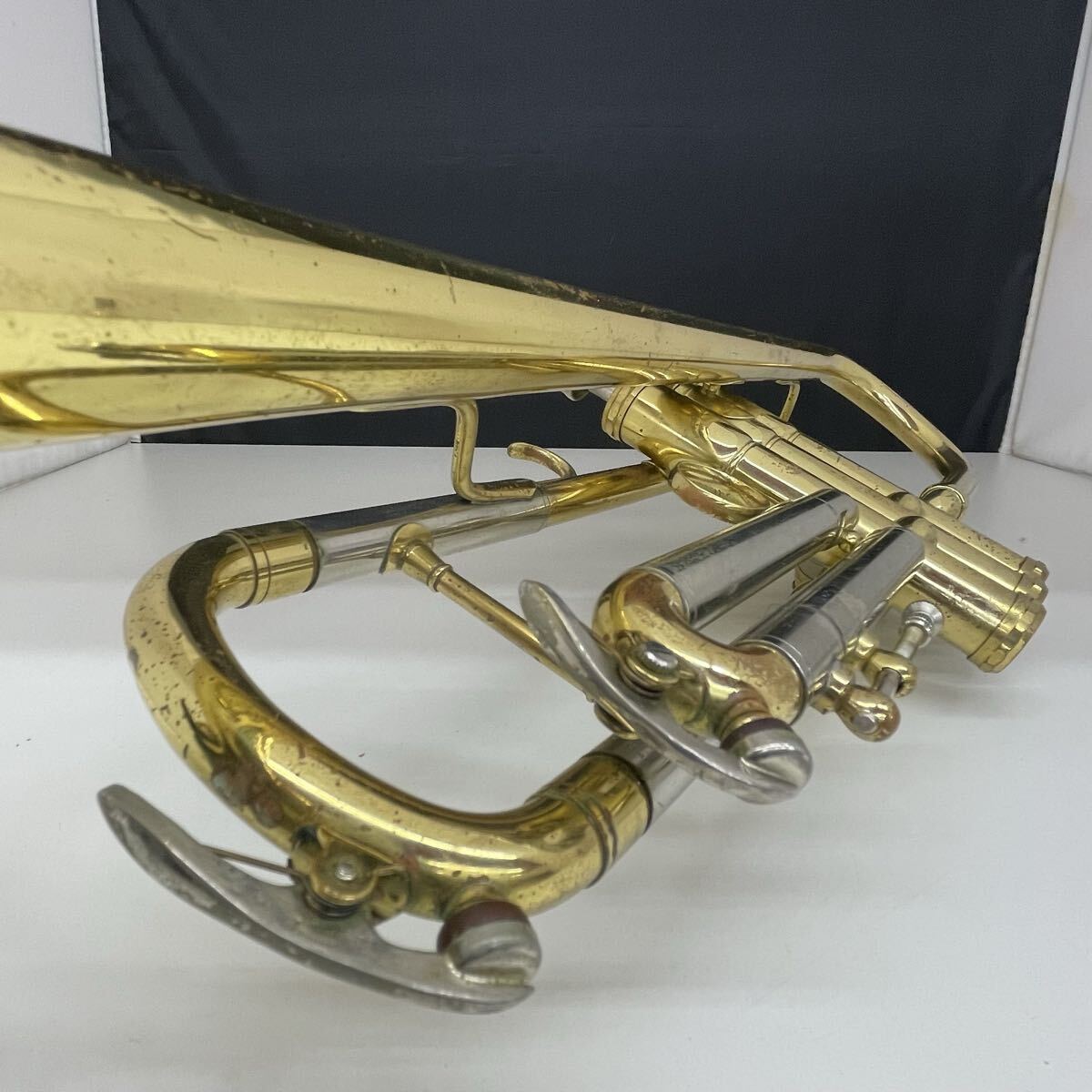 全体的に傷、錆が多く、箇所によって凹みもあります。指掛リングは若干変形しています。また主管抜差管は固着しています。ベルには多数傷がありますが、凹みや歪みはないようです。