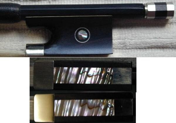 上級★バイオリン弓★カーボン弓★耐久性抜群★音色良し 丸弓(ラウンド・スティック)です。 この弓はカーボンとはいえ、音色と操作性を重視した粘りのある性質の弓で お店でも大変好評です。 棹だけでなく、フィッティングの取り付け具合や 螺子調整具合、操作性につき検品をパスした商品です。 在庫弓は大体60~62gの重量です。 お写真は在庫の内の一本の参考写真ですが同等弓を御提供出来ます。 カーボン弓ですが運動性が木に大変似ており、必要な腰、 かつ音色を損ねたくない方向けの弓と言えます。 操作性はプロにお墨付きを頂いており、大変お勧めです。 フロッグは黒檀、パリジャンアイとスライドはアワビ貝仕様です。 貝の色を見ても弓のランクが解って頂けると思います。 同工房の弓(vn用)を以前オーケストラのコンサートマスターの方にお譲りしましたら 以下のようなコメントを頂きましたので御参考下さい。 > 早いリコシェ:シェーラザードのソロや、うつくしいロスマリンなどでも、 > 毛をそんなに張らずに、気持ちよく、弓が跳ねます。 > メイヤ(仏)に劣ることなく、楽に弾けます。 > これから練習では、こっちを使う事にします。 > これ程の廃価で、百万円以上の弓にヒケを取らない弓に出会えて > とても幸せです。ありがとうございました。 だそうです。 私は自分では(仏)ボアラン、(英)TUBBSを使っていますが 経験として弓選びの時には以下の点に気を配っています。 真後ろから見て左右の曲がり、捻れが無い。 速弓でバタつかない、 スピカートの切れ味が良い、 スピカートのきっかけが弓先でも掴み易い、 スピカートの繋ぎ技がこなせ、中速のスピカートで安定した刻みが出来る、 実重量でなく弾くとき重く感じなく右指に負担が少ない、 重心が適正位置にある、 58g以上63g以下(特殊な場合を除く)、 吸い付き感の良さ (本体と喧嘩しない)、 演奏に必用な腰があること、 弓の音色の良いもので楽器を声枯れさせないもの。 出品の弓はこの条件を廉価ながら満たしています。 ■発送に必要な送料 無料 返品特約 欠陥品・不良品の場合に限り、7日以内の返品に応じます。 お客様の都合による返品はお受け出来ませんので御了承願います。 ※返送時の送料は御負担願います。 ※ご返金:落札手数料+発送時の送料分を差し引いた額をお返し出来ます。