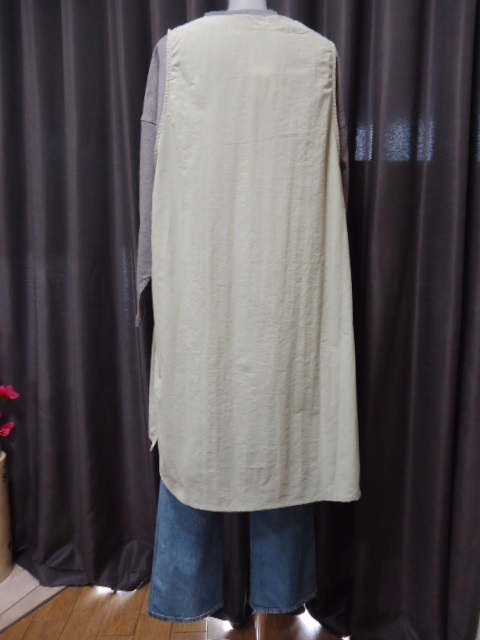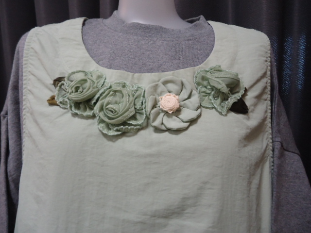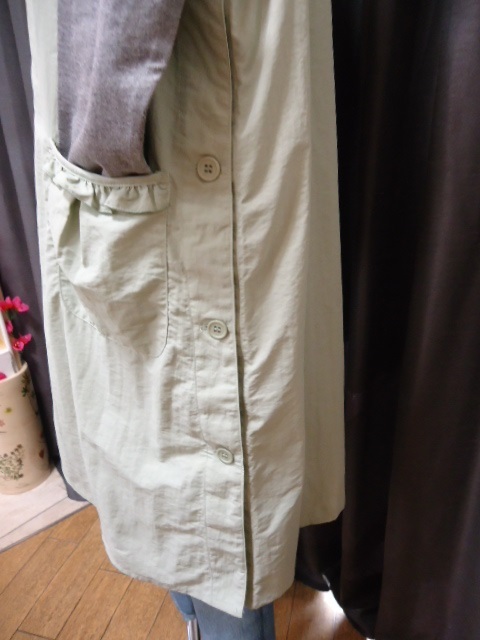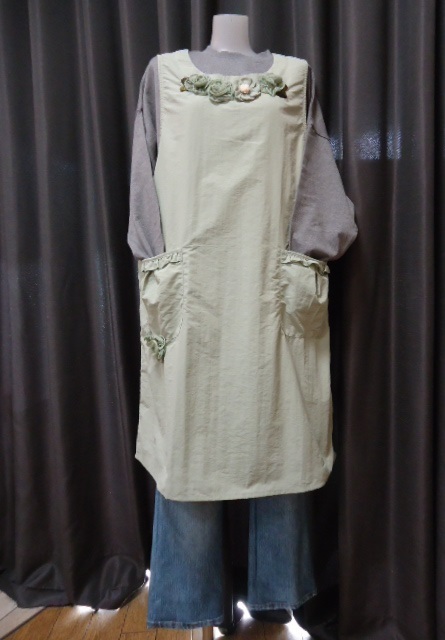 かわいいエプロン  かぶり 無地グリーン色 ★bonte★ ナイロン100% M~L寸 着丈95cm Kー5769