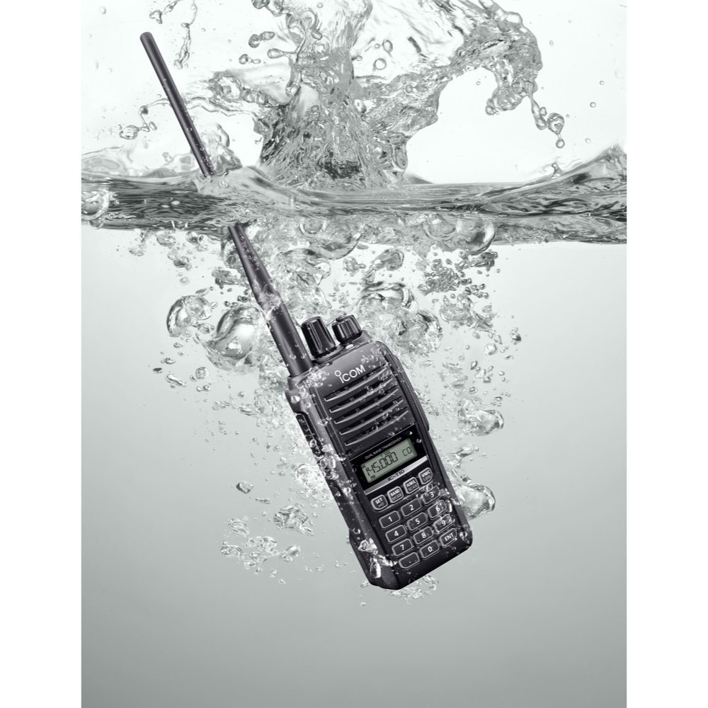 1 バッテリーパック、アンテナを正しく装着した状態で、試験用粉塵を1m3あたり2kgの割合で浮遊させた中に8時間放置したのちに取り出して、無線機の内部に粉塵の侵入がないことです。また、バッテリーパック、アンテナを正しく装着した状態で、水深1mの静水(常温の水道水)に静かに沈め、30分間放置したのちに取り出して、無線機として動作することです。(オプションのスピーカーマイク、ヘッドセット等の使用時を除く)