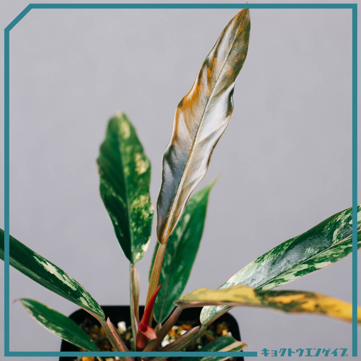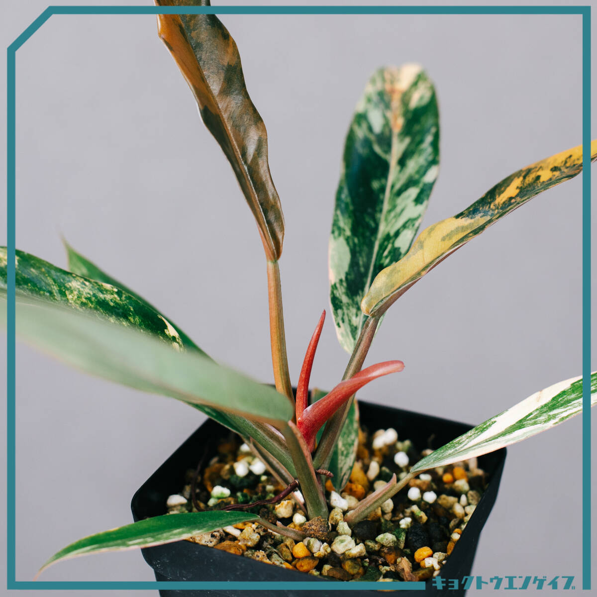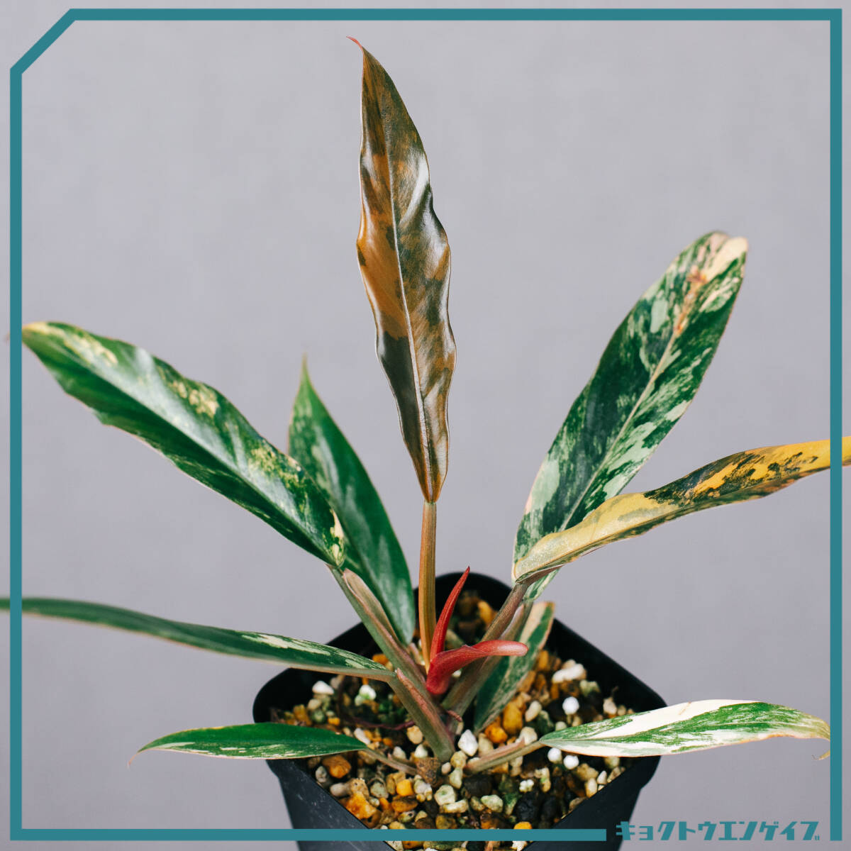 キャラメル色・オレンジ・ピンク・クリーム・グリーンがマーブル状に入り混じる、まさに“絵画的”な斑入りフィロデンドロン。葉ごとにまったく異なる表情を見せ、1株で多彩なカラーバリエーションを楽しめるのが大きな魅力です。新葉は淡い色味で展開し、成熟するにつれて色のコントラストが強まり、鮮やかな模様へと変化します。成長は比較的ゆっくりで、コレクション性が非常に高い品種です。