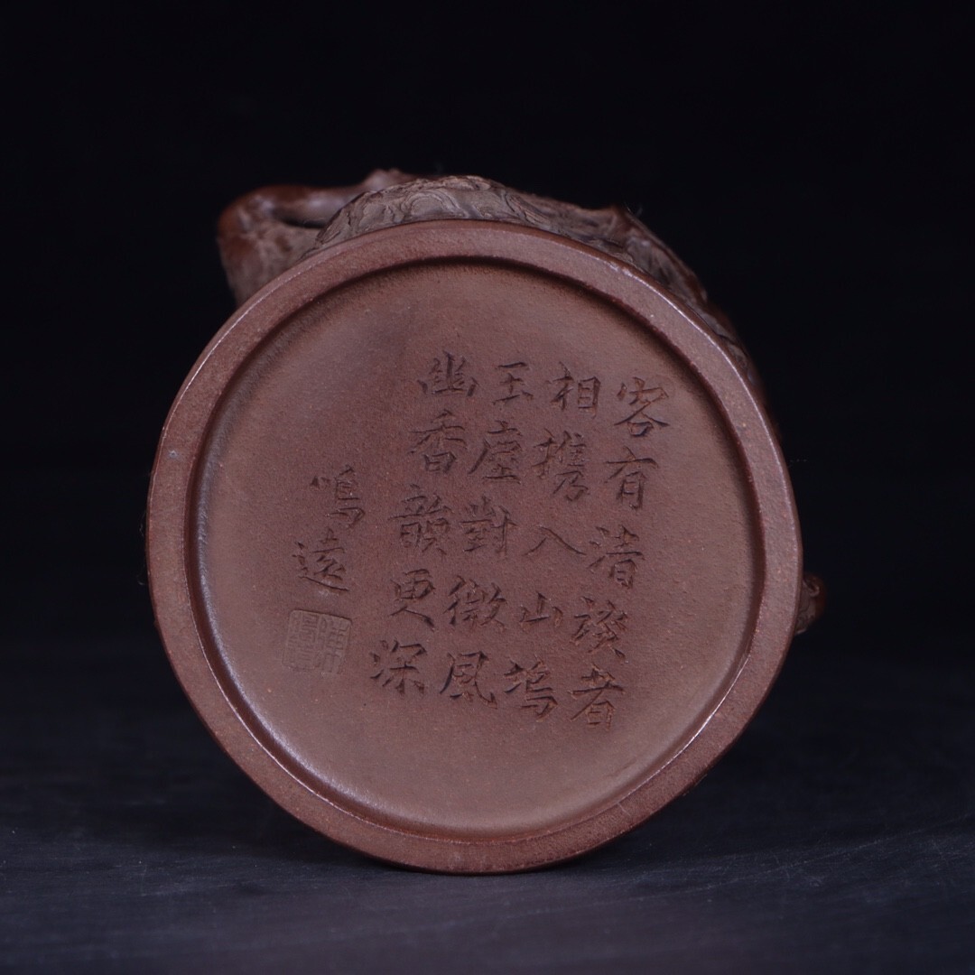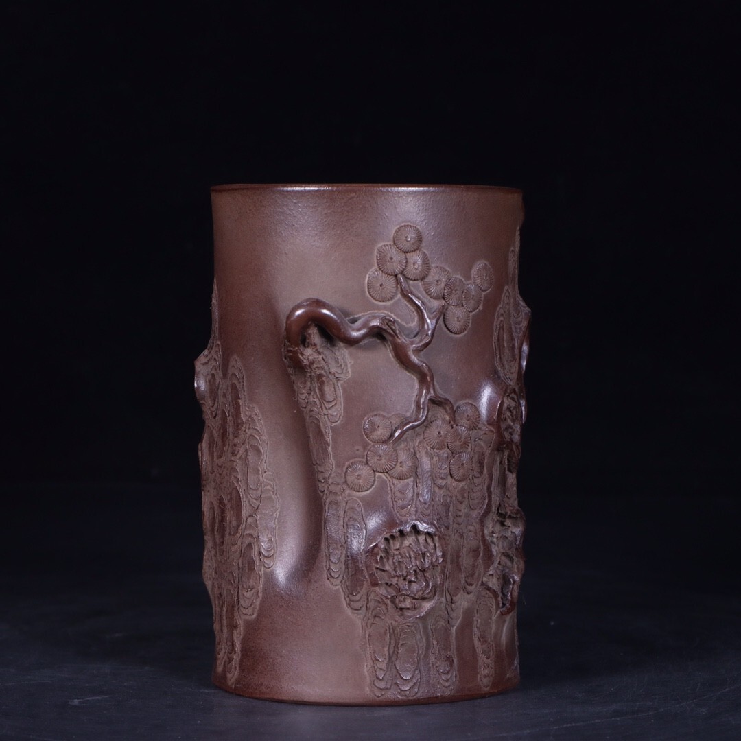 「紫砂彫 堆絵松枝松葉 松パイル 筆筒 陳鳴遠銘 清時代」陶磁器 置物 擺件 古賞物 中国古美術 蔵出