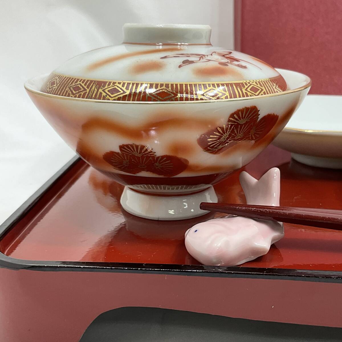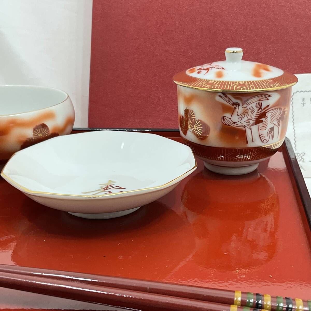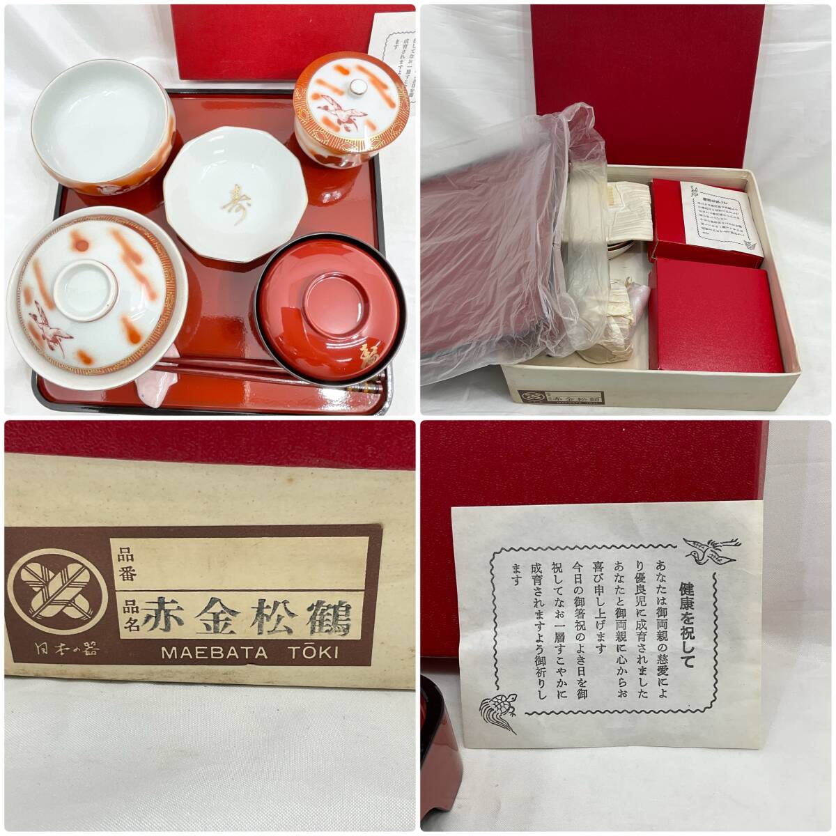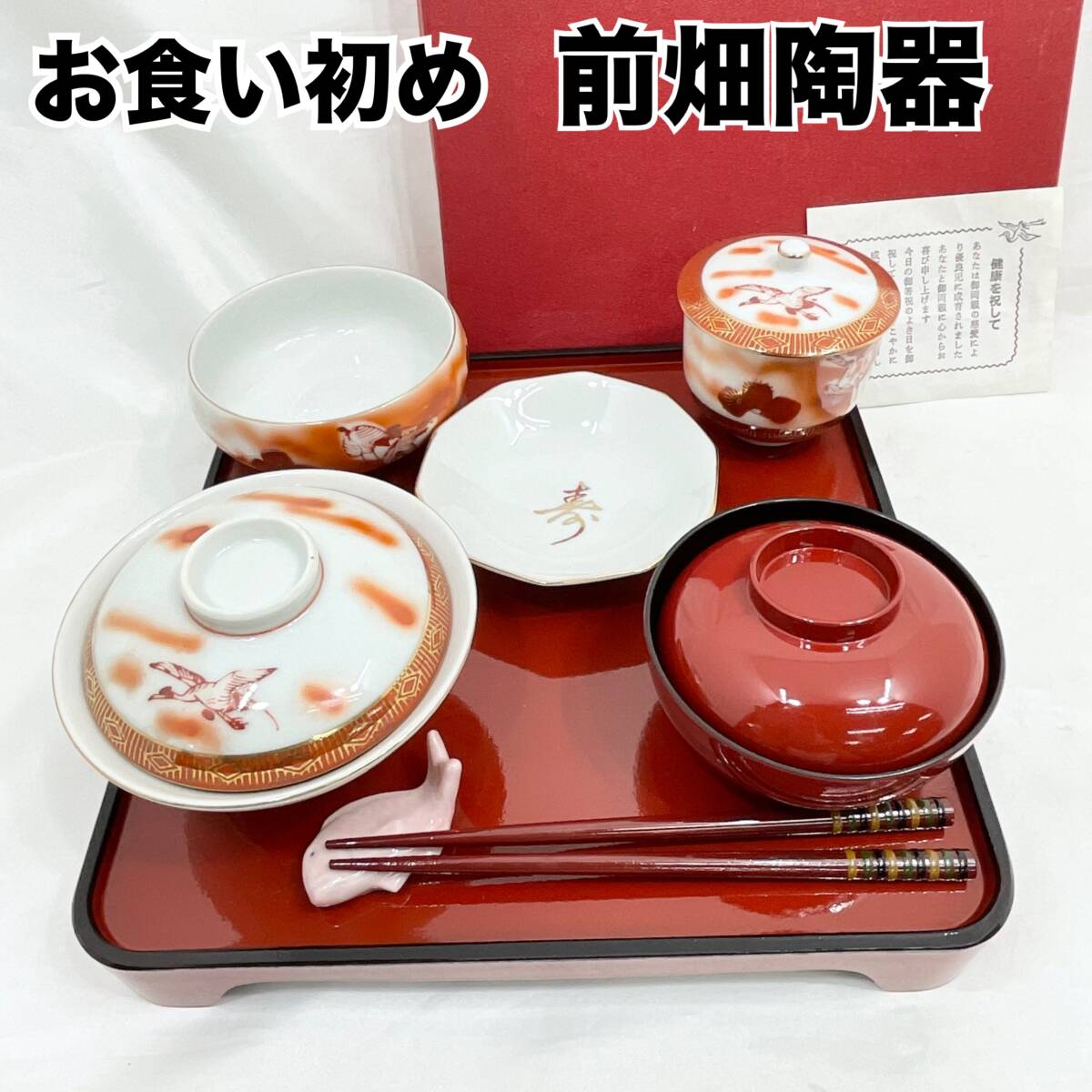 前畑陶器 お食い初め食器セットです。縁起の良い赤金松鶴の柄入りの食器です。状態は良いものです。是非御検討ください。