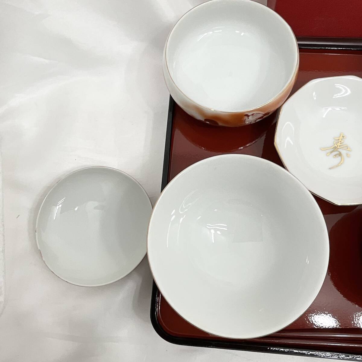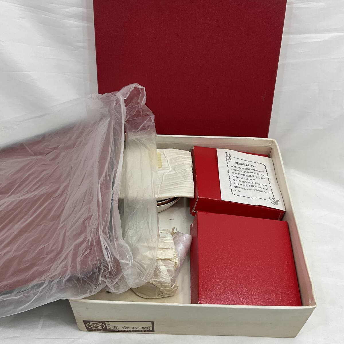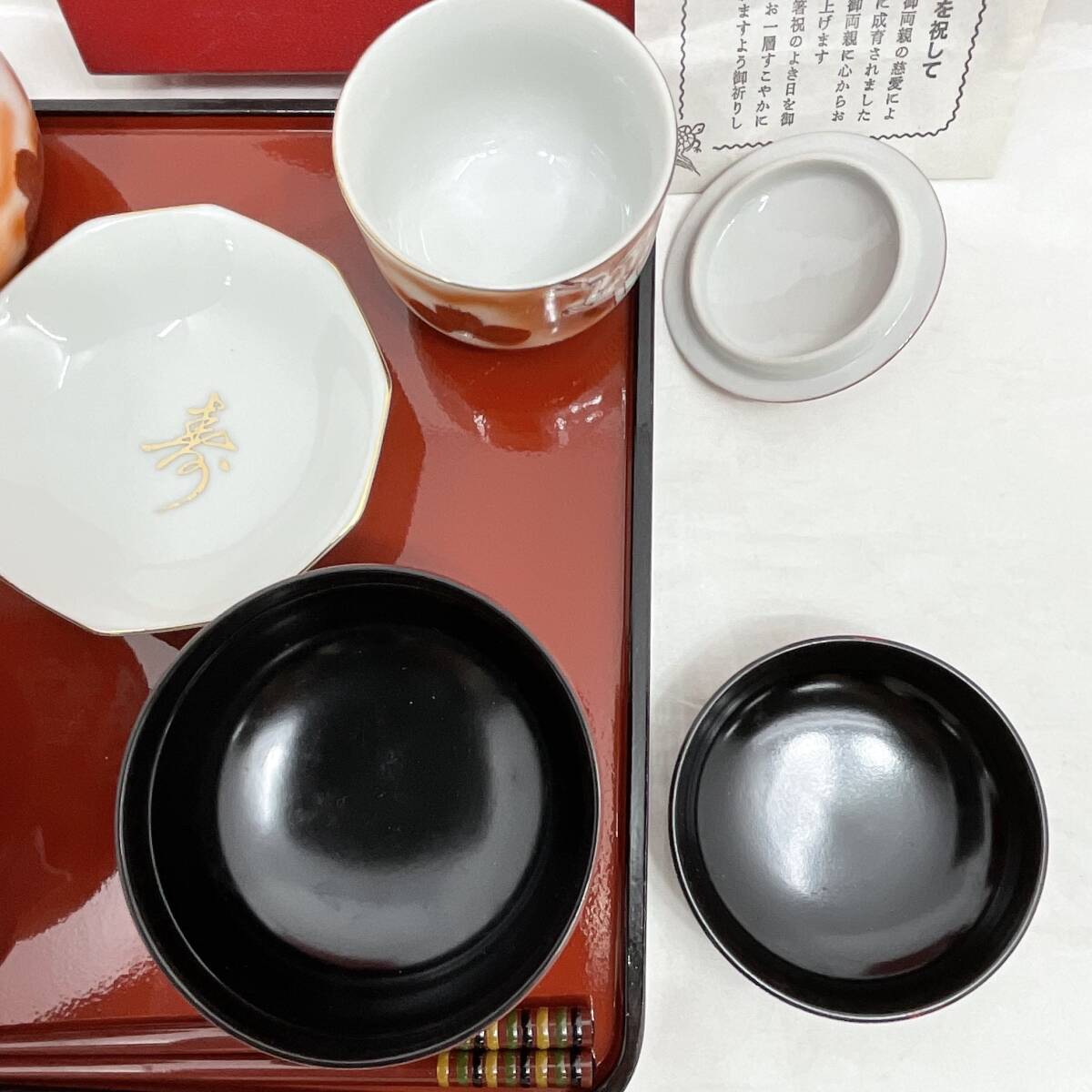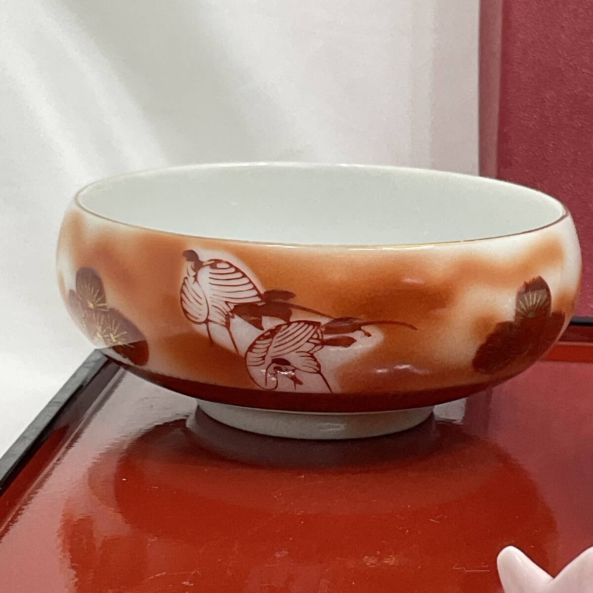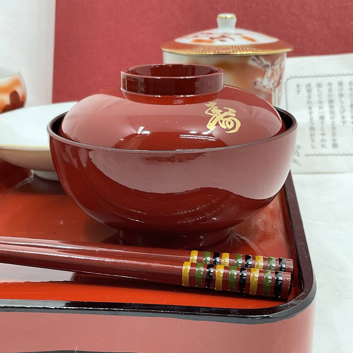 前畑陶器 お食い初め食器セットです。縁起の良い赤金松鶴の柄入りの食器です。状態は良いものです。是非御検討ください。