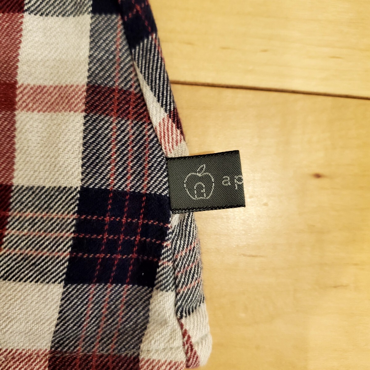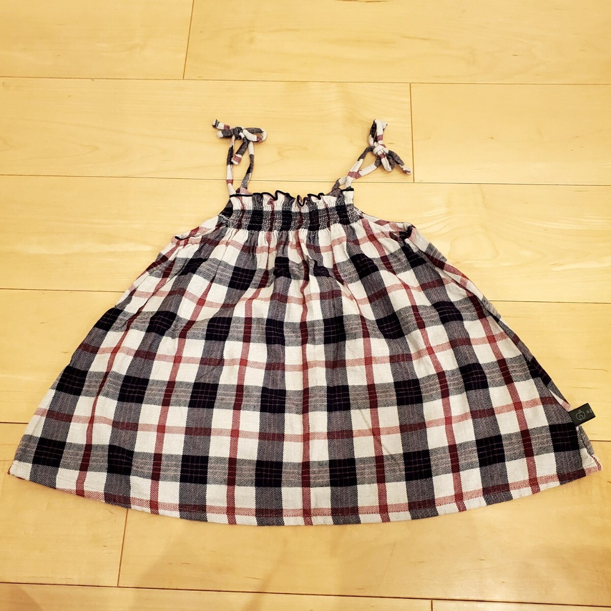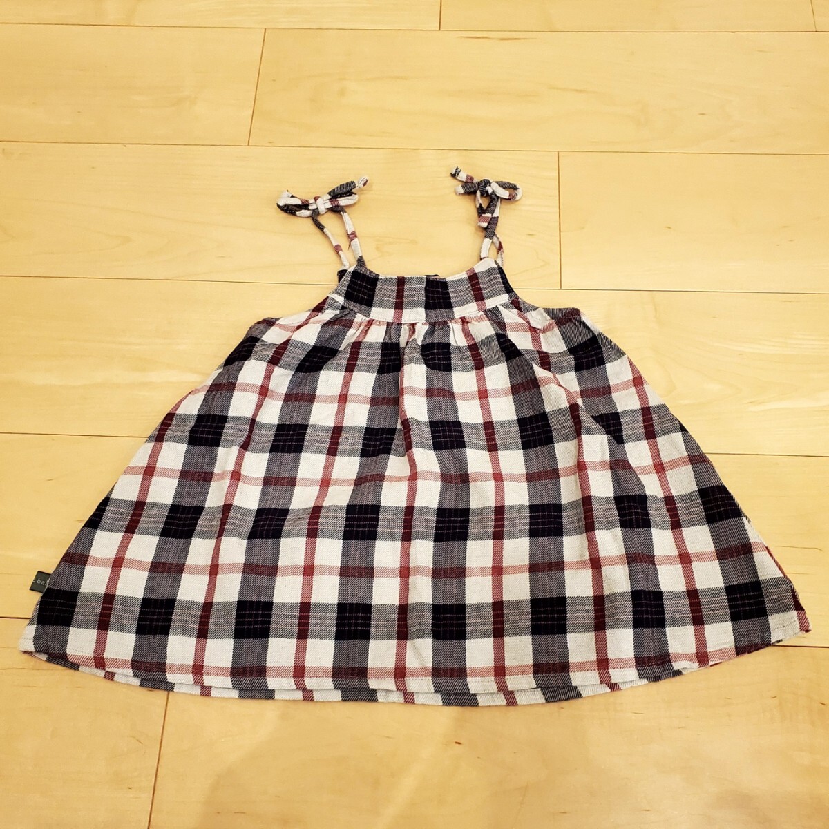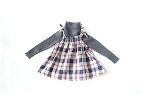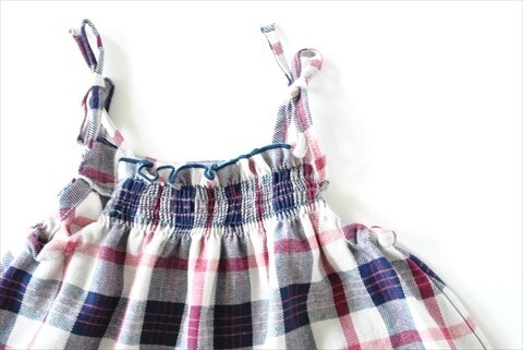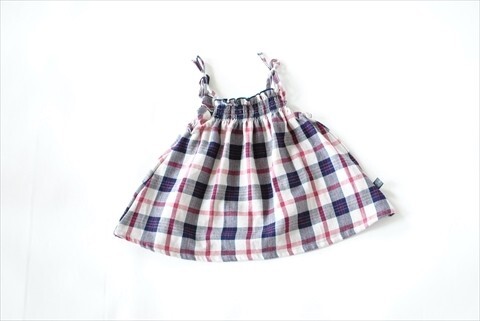 肩のヒモの結び方でサイズ調整ができるので長く着られます。