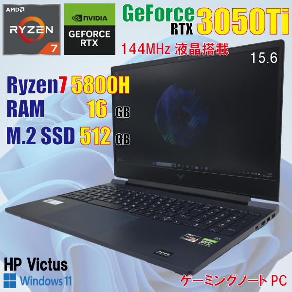 ゲーミングPC HP Victus / Ryzen7 5800H / 16GB / RTX3050Ti / M.2 512GB / 15.6インチ 144MHz フルHD / Wi-Fi / USB-C / Windows11 / 美品