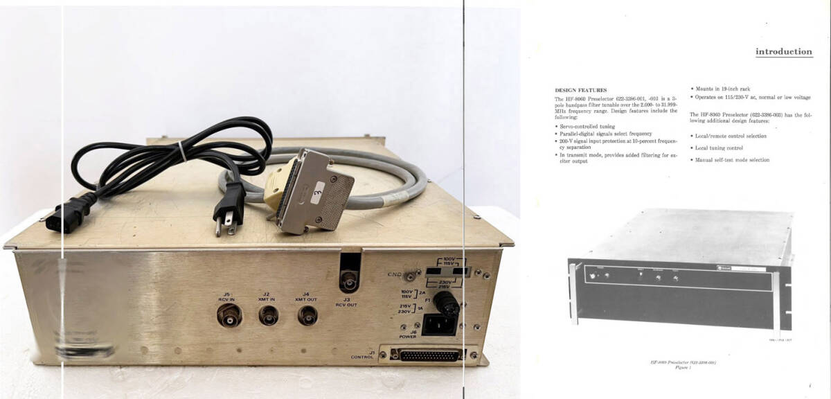 ★Collins HF-8060 Preselector コリンズ 送受信用オートチューン プリセレクター 動作確認済 ★①英文の取説約300ページ弱のpdfファイルDVD ②コントロール用接続ケーブル ③電源ケーブルが付きます。現状でお願いします! ★利用周波数帯はは2Mhz~31.99Mhzとのことです。 ★知人の終活品で、コリンズ HF-8014に写真にある付属品のコントロール用接続ケーブルを使用し、3.6Mhz 29Mhzで送信動作テストを確認済みです。添付写真参照 ★HF-8014 8010等の送信機系 HF-8050 8054 851S-1等 HF-80シリーズで利用可能と思います。 ★HF-80シリーズのサムホイールスイッチや851s‐1のダイヤルの周波数変化に連動しオートプリセレクタ動作します。 ★接続は後部端子を見れば、おおよそ取説なくても判断できると思います。 J5 RCV IN はC型コネクタ、他はBNCコネクタです。落札者様でご用意ください。 ★掲載写真にあるコントロール用接続コネクタ、電源ケーブル、英文取説のPDFファイルDVDを付属させます。動作確認はしておりますが、古い機器ですから、HF-80シリーズに詳しい方で、、現状扱いということでお願い致します。