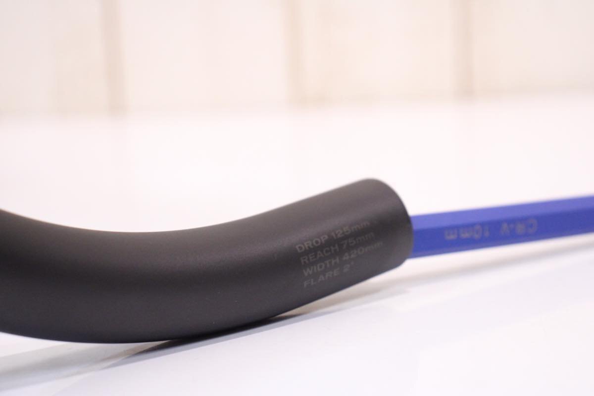 | 仕様 | クランプ径:Φ31.8mm 計測重量(掲載写真状態): 222g メーカーサイズ: ハンドル幅 ブラケット芯-芯: 420mm エンド芯-芯: 420mm ドロップ: 125mm リーチ: 75mm フレア:2度 |