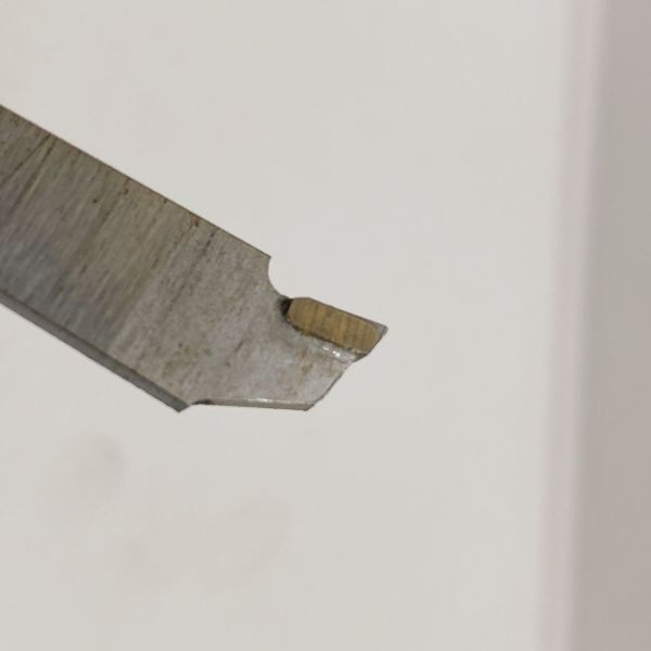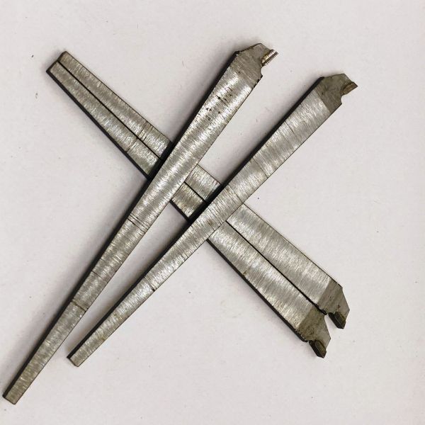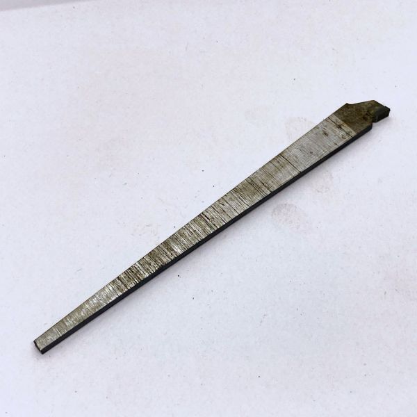 最大寸法 約110x10x3mm 重さ約13g これ一個おとどけ。 未着の場合はもう一個お送りします。 三木の藤田丸鋸さんの協力のもと、仕損じたチップソーを再加工リメイク品。台金の錆はあるものとします。 ダイヤモンド砥石、ヤスリ以外では研げませんが再研磨してとても永く使えます。 そもそも超硬なので、再研磨の機会すら通常使用の環境ではナカナカ訪れることはないでしょう。 木片の代用定規を当てて引っ張るとモリモリホゲます。差し金とか当てると、差し金自体も削ってしまうので使ってはいけません。 左右に傾けて、線幅調整ください。ケヒキ刃、ケガキ針向けの素材に加工転用してもよいと思います。 先端傾き角や先端逃げ角などなど、大工、木工家の方々からすると違和感があると思うのですが、とりあえず実際に彫ってみてからその違和感と向き合ってみてください。 叩いて使う場合は、保障外。つまりうまく加工すれば銘切、刻印用タガネになりますので普及型の全鋼ステン包丁熱処理後程度の身でもザクザク掘れますが、ロウ付けチップ部分が飛ぶ可能性はあります。台金は55Cを台金用の熱処理ですから、割れはしませんが叩くと滑る感じがして芳しくないです。適当に尻を赤めて戻してください。 |
