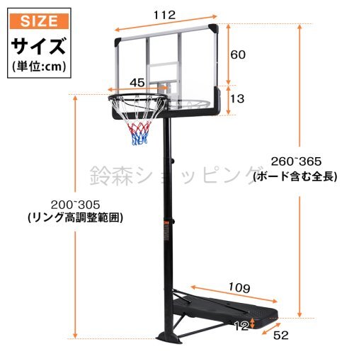 バスケットゴール 高さ8段階調節 公式&ミニバス対応 200-305cm 移動可 工具付き ゴールネット バックボード リング ミニバス 一般用屋外用