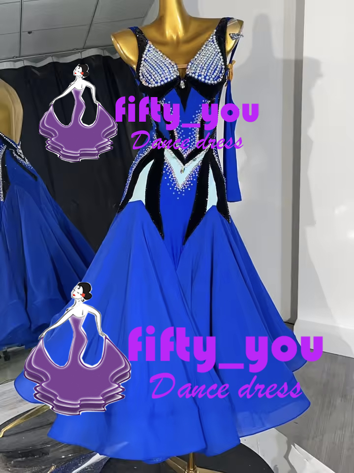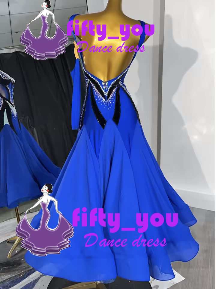 新品fifty_youレディース社交ダンス衣装 競技会用ドレス セミオーダー  スタンダードドレス 美しく着痩せするデザイン ロイヤルブルー