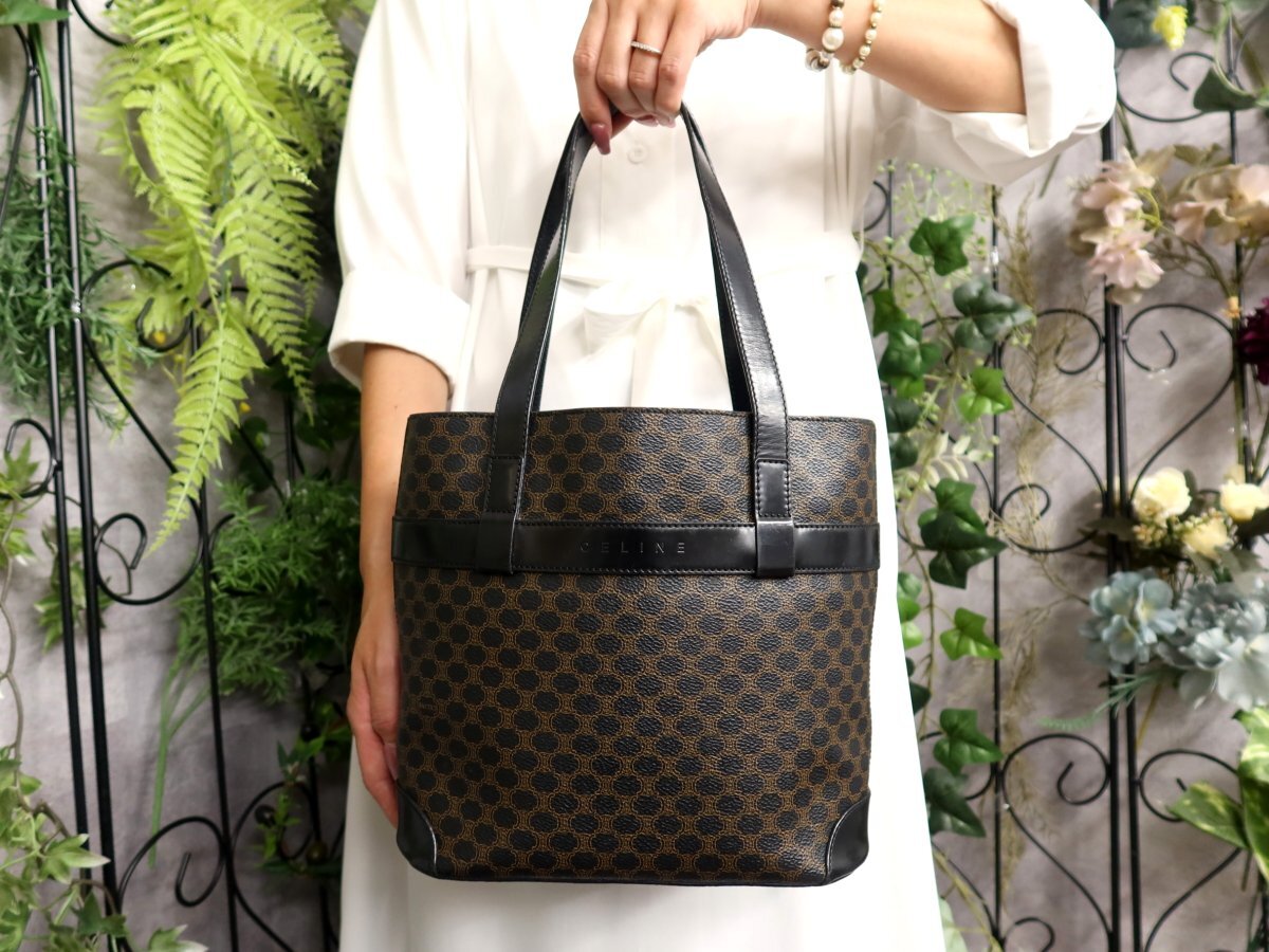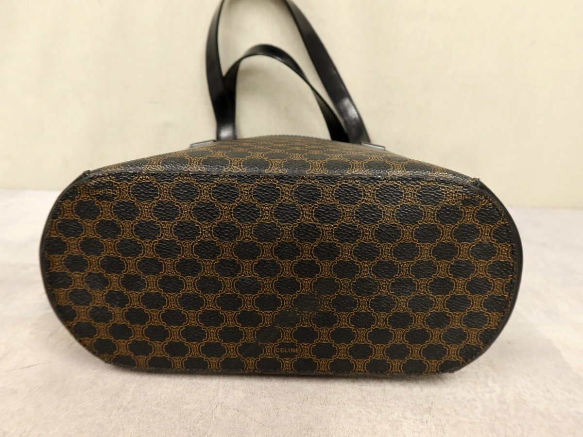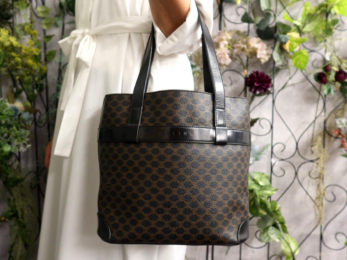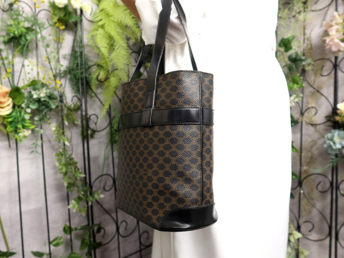 ●超美品●CELINE セリーヌ●マカダム●ロゴ型押し●PVC カーフ レザー 本革●ハンド トート バッグ●黒 ブラウン●ゴールド金具●Js60838