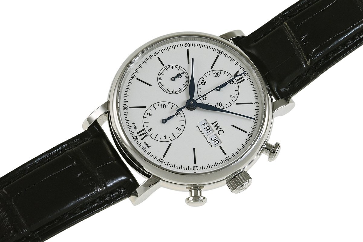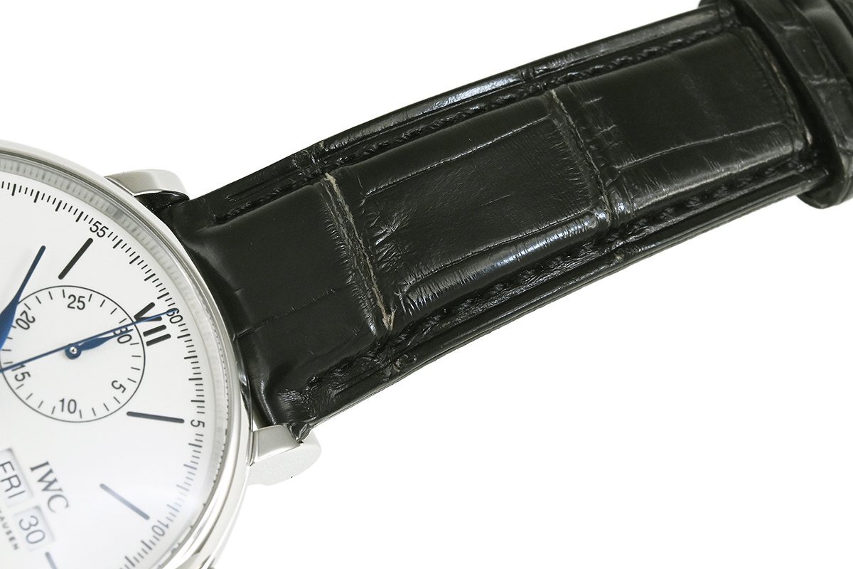 【コメント】 2018年に創立150周年を記念するIWCジュビリーコレクションとして発表された限定モデルです。技術と優雅さを見事に融合させたポートフィノコレクション「ポートフィノ・クロノグラフ」2000本限定モデルです。キレイなホワイトラッカーダイアルにブルースティール針を採用、IWC自社製キャリバー79320を搭載しております。裏蓋に使用に伴う多少の擦りキズはありますが、目立つ様な深いキズはありません。革ベルトは、12時側おもて面の節の部分が上面だけ裂けています(8枚目画像)。その他側僅かなコバ部分の剥げや軽い尾錠の留め痕はありますが目立つ汚れ等はありません。2019年4月に購入品で、2023年6月に当店修理サービスにてオーバーホールをしています。現在精度は平置きで日差+6秒程です。