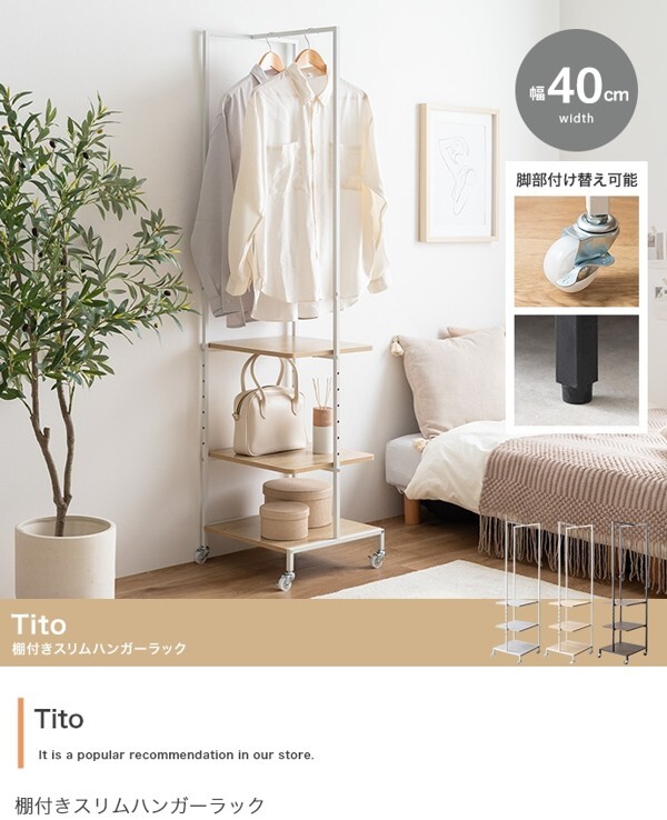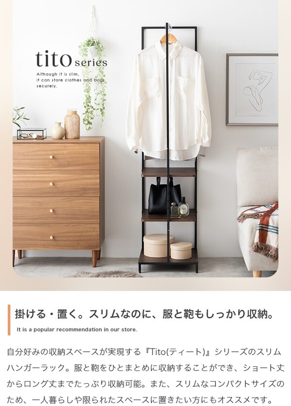 ※現在ご覧の商品ページはストーングレーのご購入ページとなります。 ヤフオクの仕様上単一ページに複数バリエーションを掲載することができませんので、他バリエーションが希望の場合は別ページでご購入お願い致します。 スリムなのに服と鞄をしっかり収納できる『Tito(ティート)』シリーズのハンガーラック。 掛けると置くを両立でき、自分好みの収納スペースが実現します。 8段階で動く可動棚とハンガーバーは服と鞄をひとまとめに収納することができ、ショート丈からロング丈までたっぷり収納可能。 また、スリムなコンパクトサイズのため、一人暮らしや限られたスペースに置きたい方にもおすすめです。 配達業者を指定いただくことはできません。 沖縄・離島に関しましては、別途配送料が必要となります。 北海道への配送も別途配送料が必要になる場合がございます。 ※別途送料が発生する場合は後ほどご連絡させていただきます。 タイミングによっては在庫切れの場合があります。