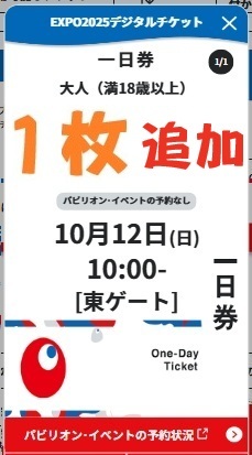 大阪・関西万博 EXPO2025 入場チケット 大人 10月12日 10時入場 予約済 10/12 追加分 | |
